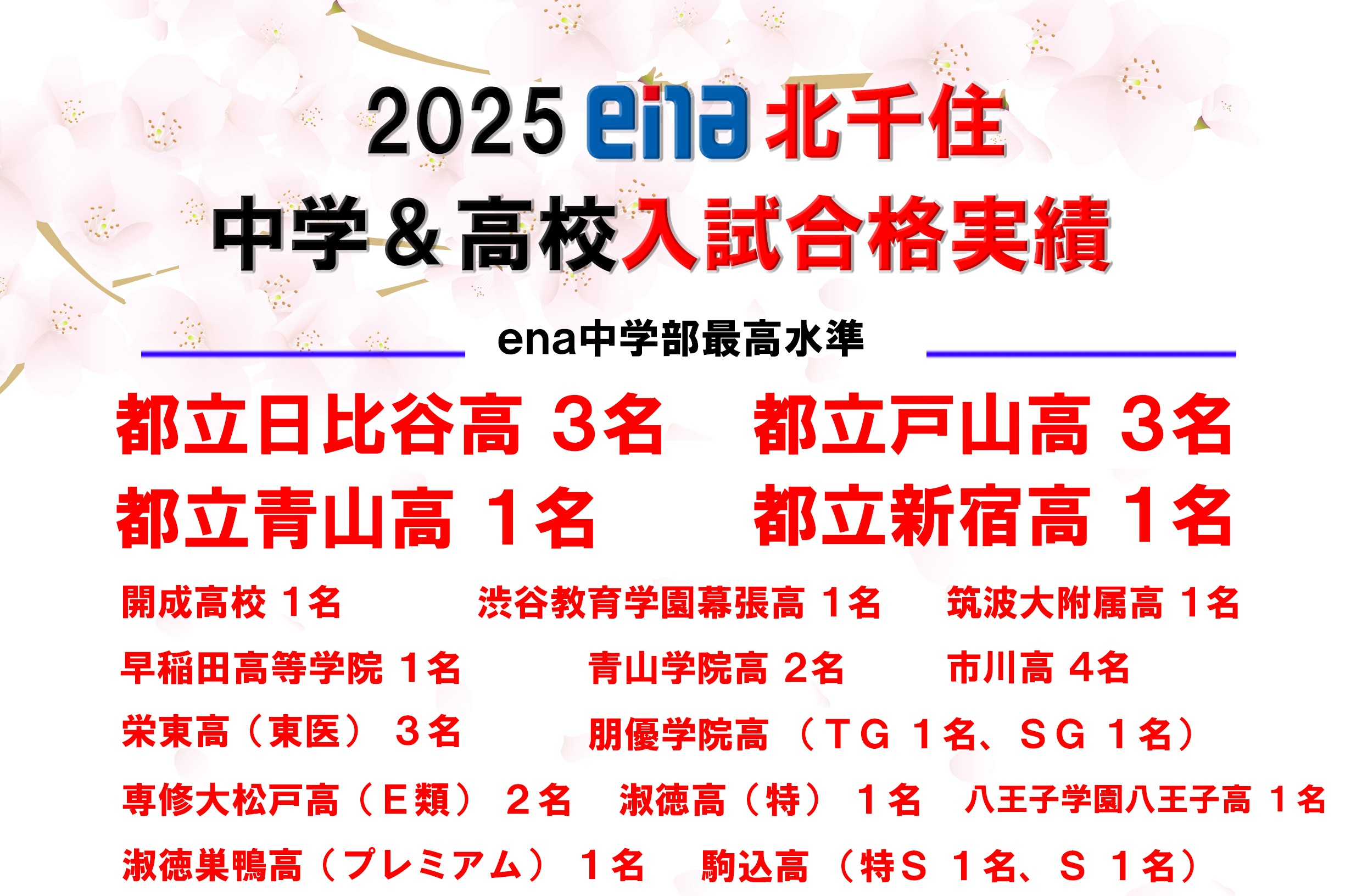 国私立 開成1名 渋谷教育学園幕張1名 筑波大附属1名 早稲田高等学院1名 青山学院2名 市川4名 など