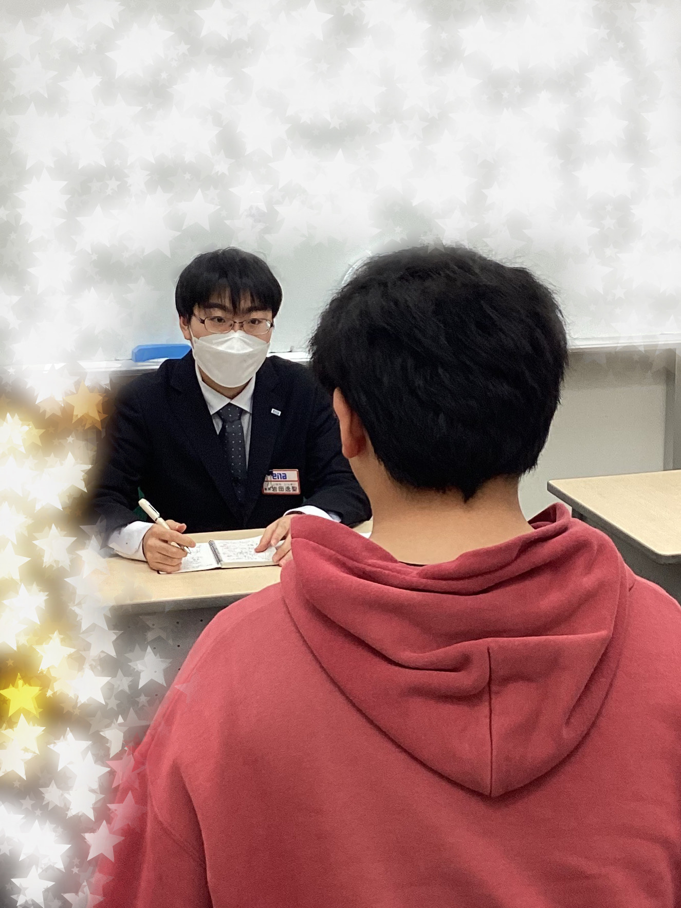 これから面接を受ける生徒に向けて、「お守り」と評してアドバイス。