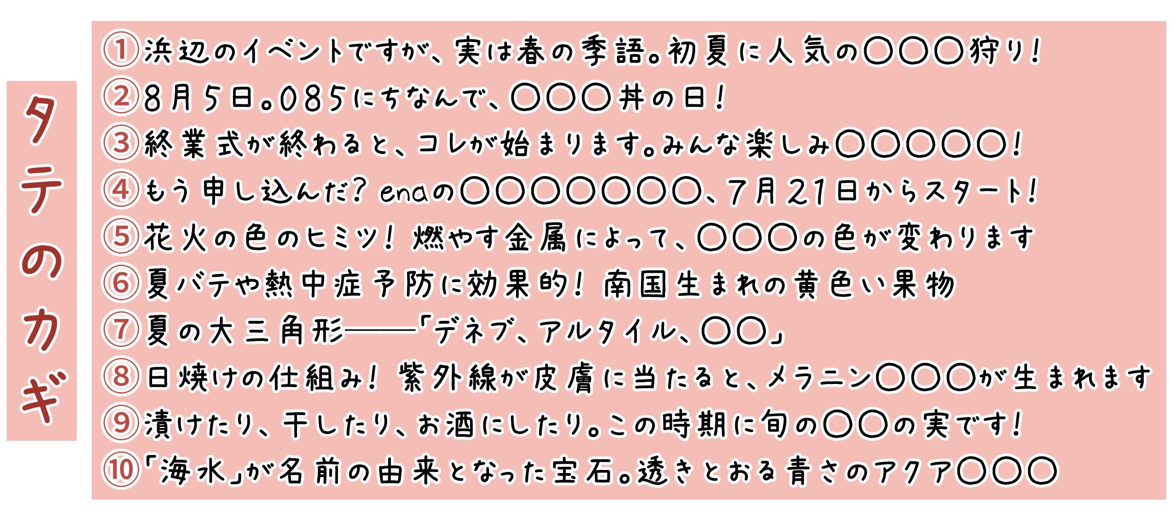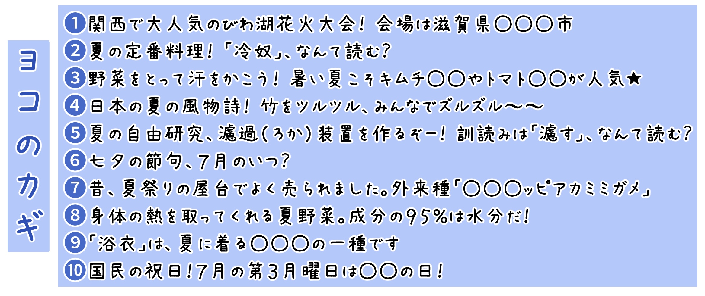 こちら、夏をテーマにした「遊ぶとちょっと賢くなる⁉ 先生からの挑戦状☆」です。