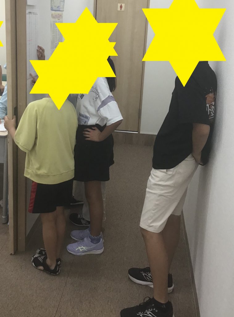 休み時間に廊下に張り出されたランキングを見る小6の様子です。ライバルの校舎との点数を比べて、次はより高い点数を取ると決意していました!