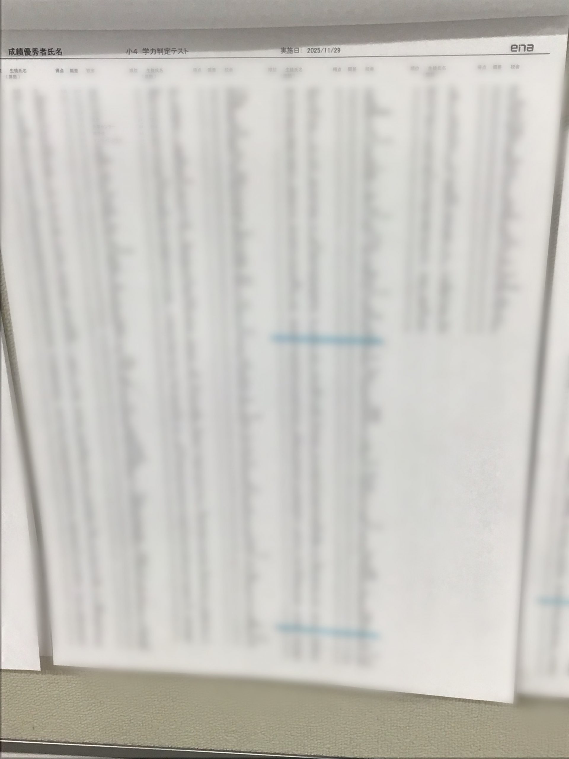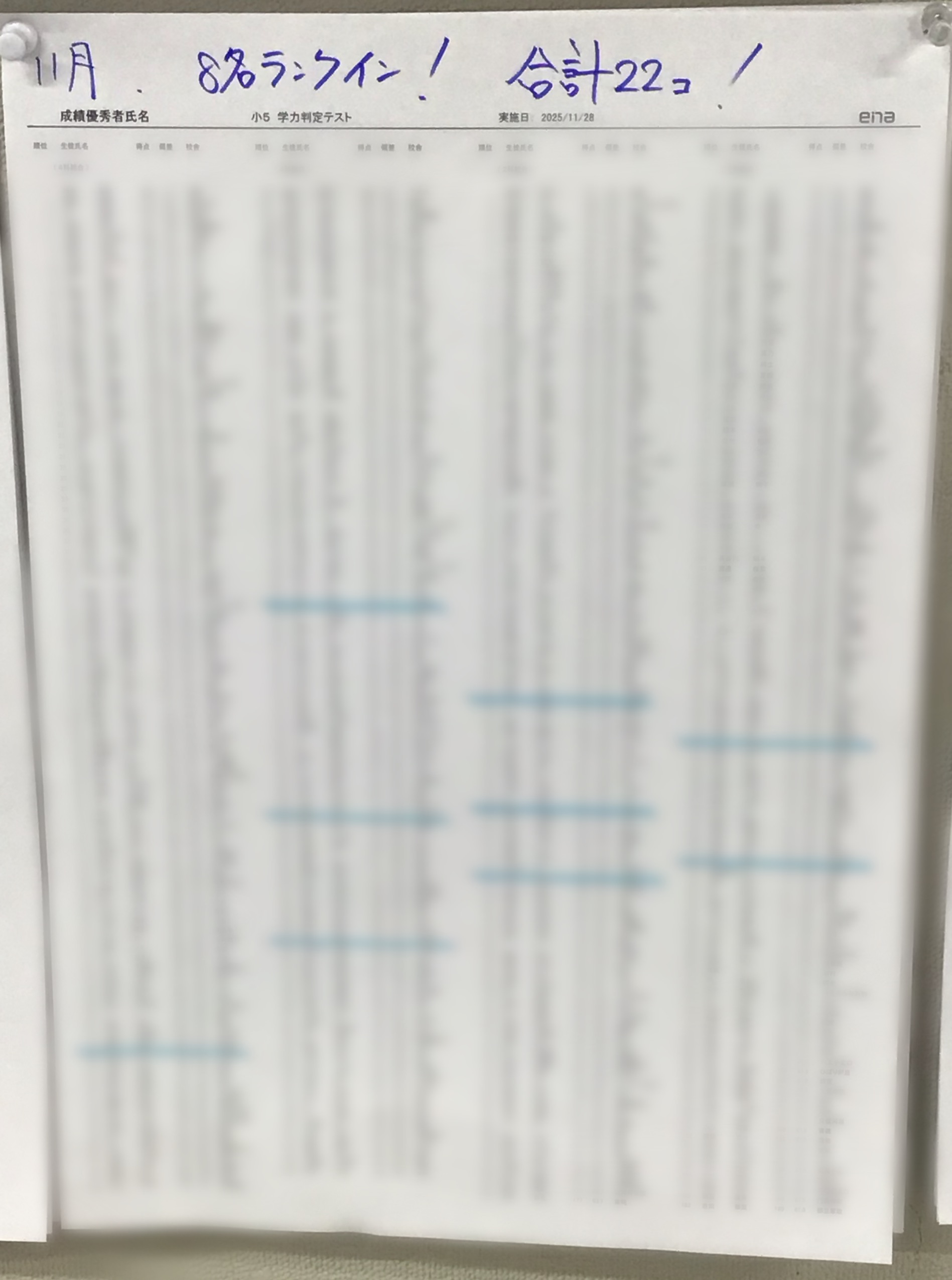 個人情報のためモザイクを入れていますが、青線が日暮里校舎の優秀者です。