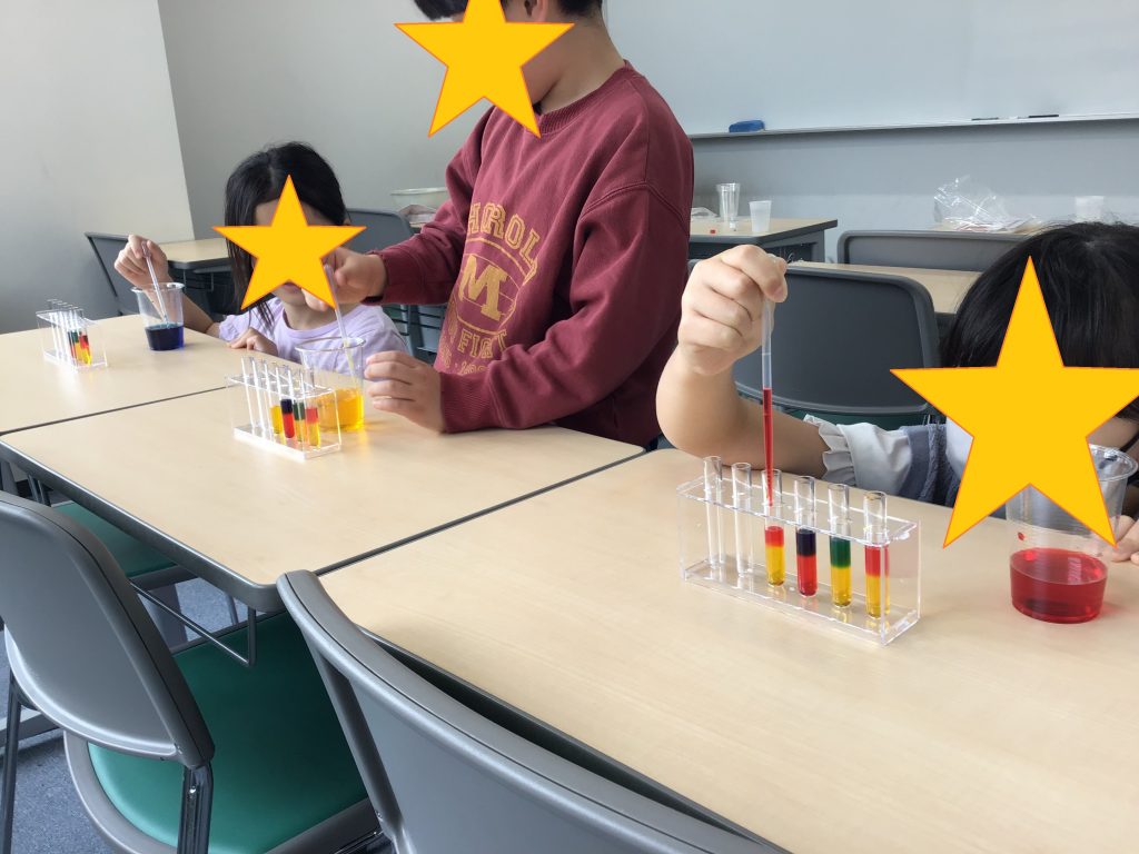 今回の教材は「レインボーリキッド」で、水溶液の密度を考えながら色水の層をつくりました。