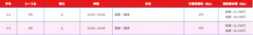 小2生・小3生本科クラスの曜日・時間帯等は以下となります。