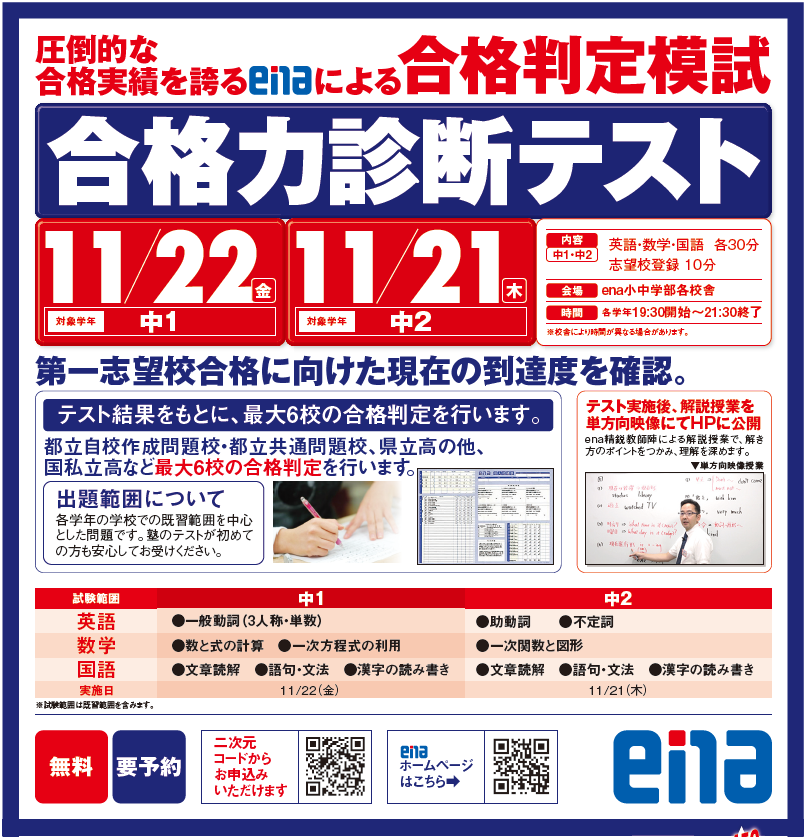 来週、中1・中2生は授業内で「合格力診断テスト」があります!