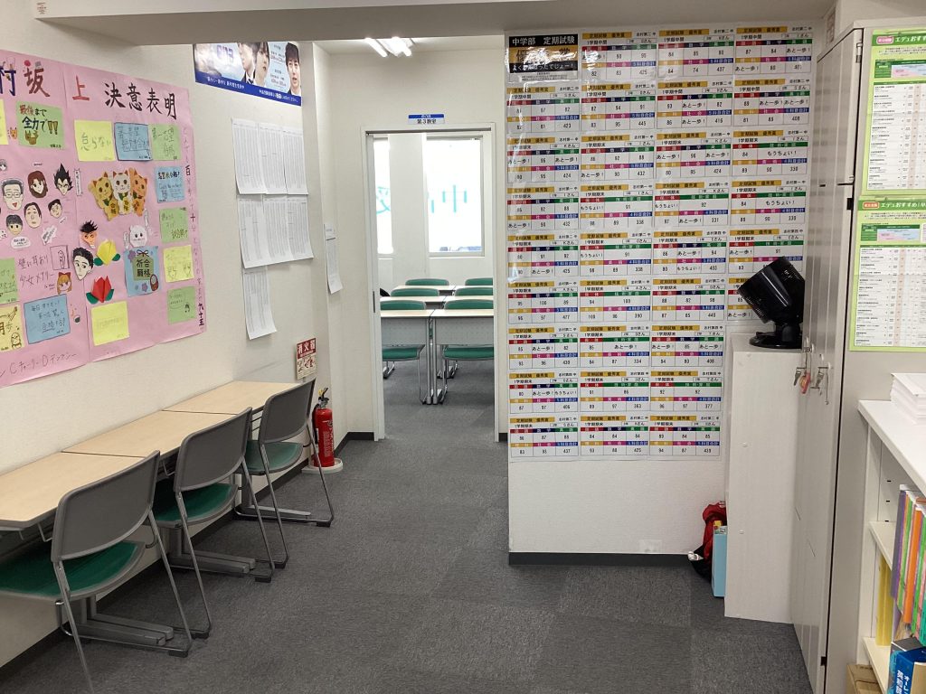 エレベーターを降りて右を向くとこんな感じです。成績優秀者リストや決意表明が貼ってあります。