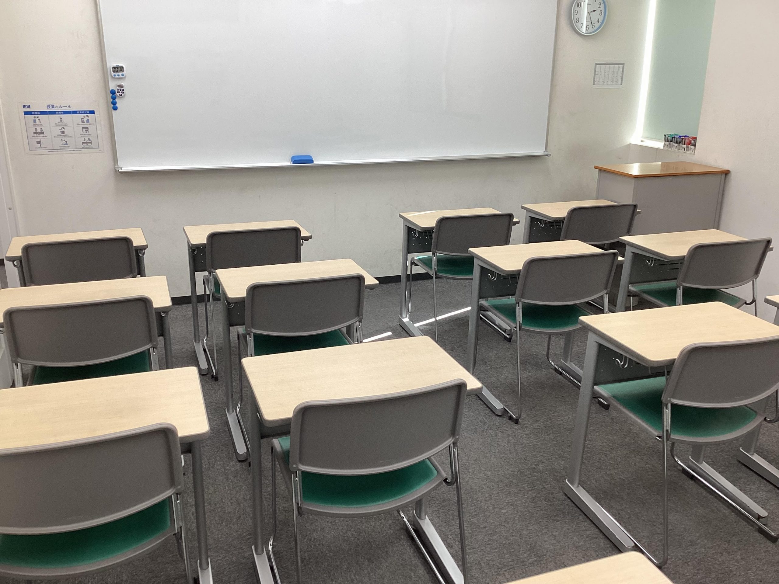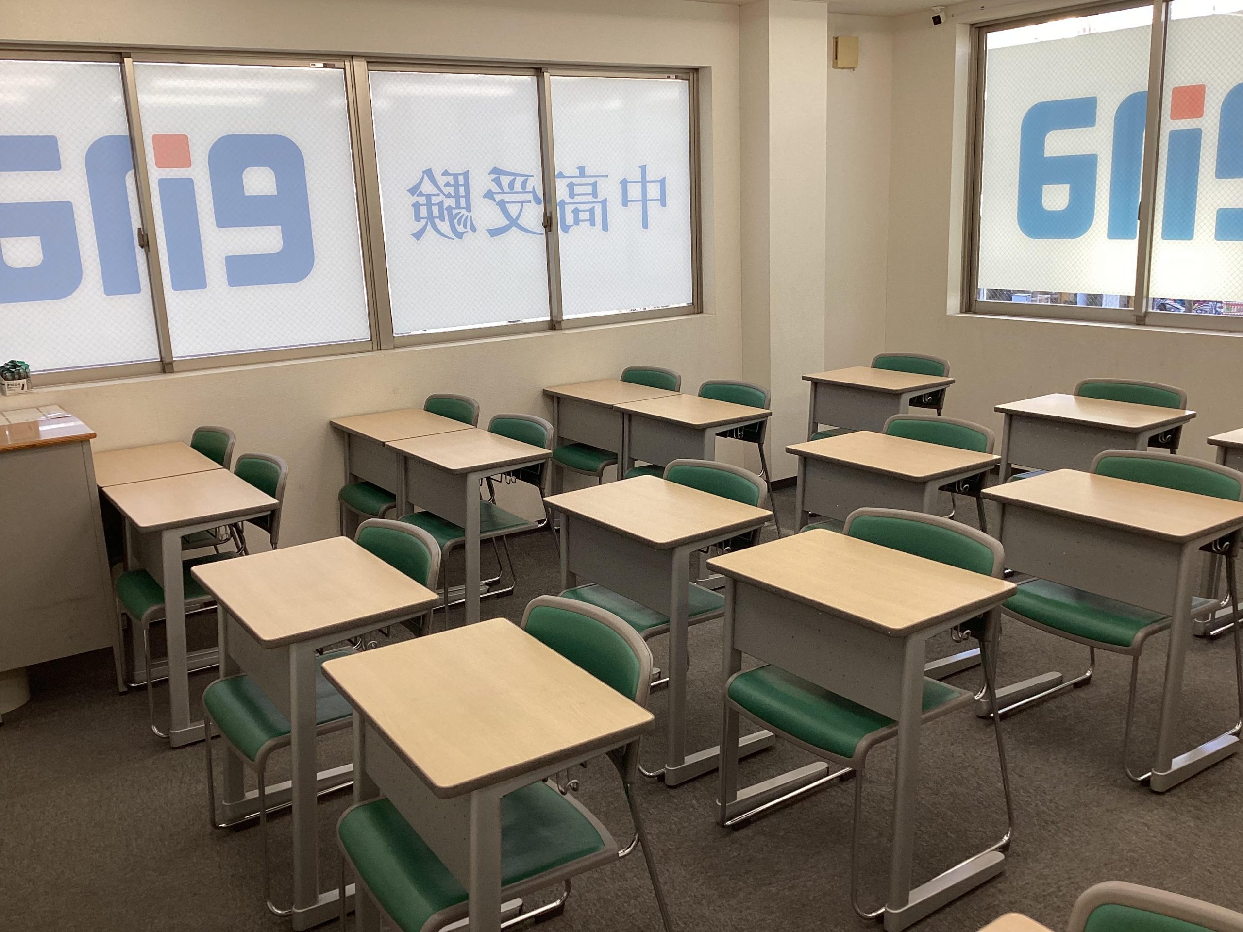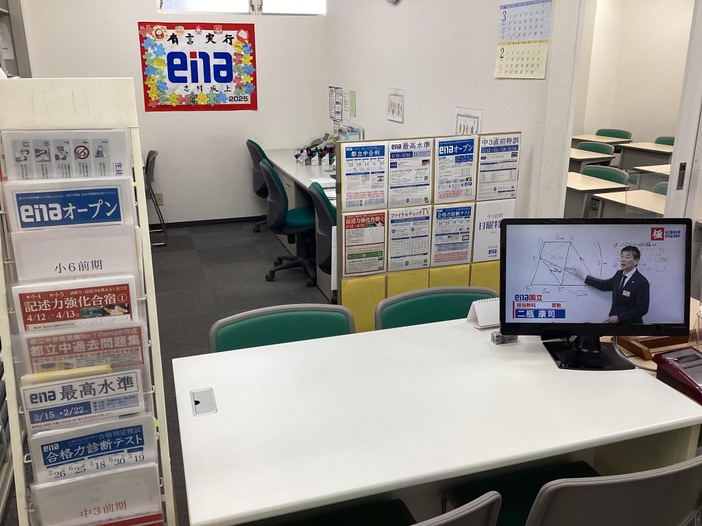 エレベーターを降りて正面の様子です。受付カウンターや教師の机が配置されています。