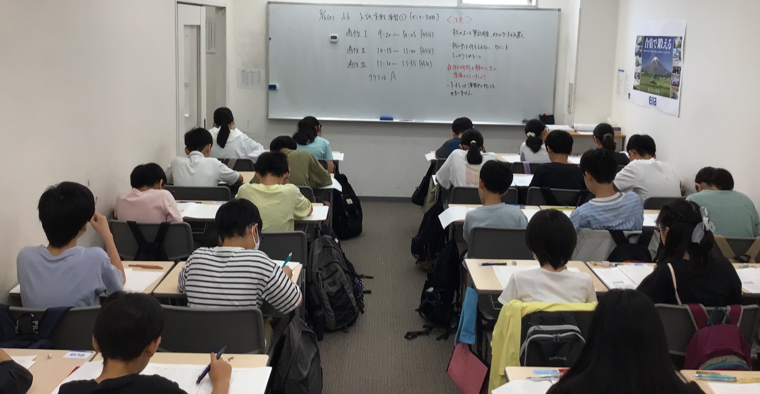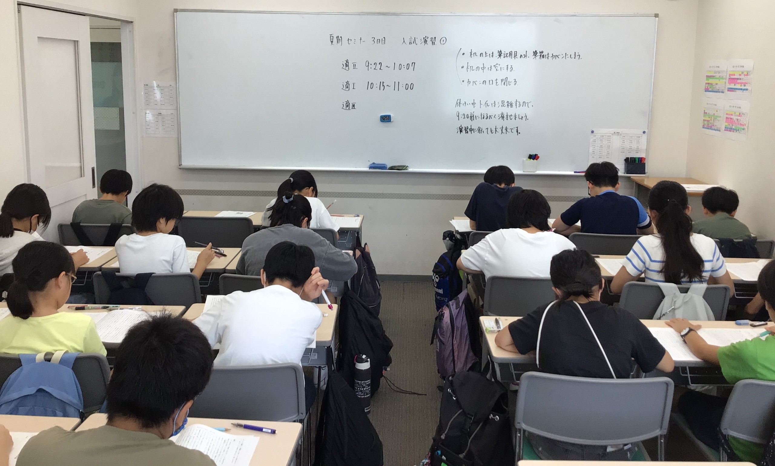 近隣校舎の同学年の生徒が同じ会場に行き、夏期講習会で学んだことの復習や実践的な入試演習などを行う期間です。