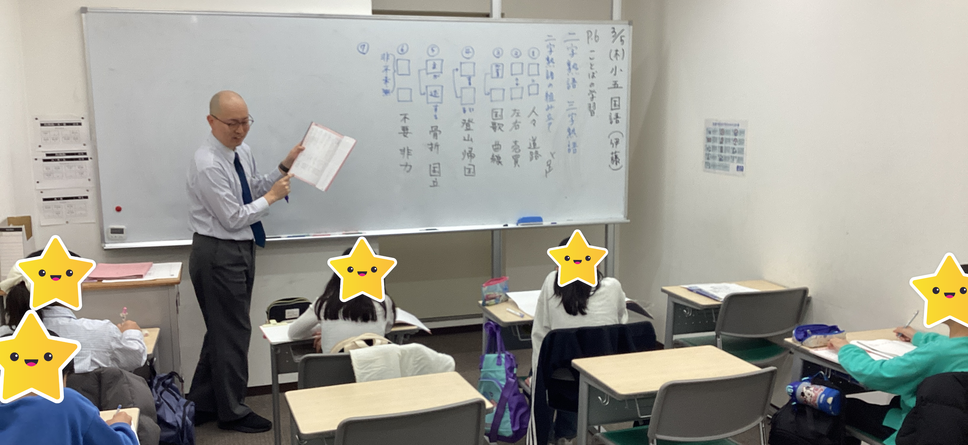 伊藤先生の国語の授業。新小5の生徒たちに、伊藤先生はノートの取り方、授業の受け方から、一つ一つ丁寧に説明していきます。