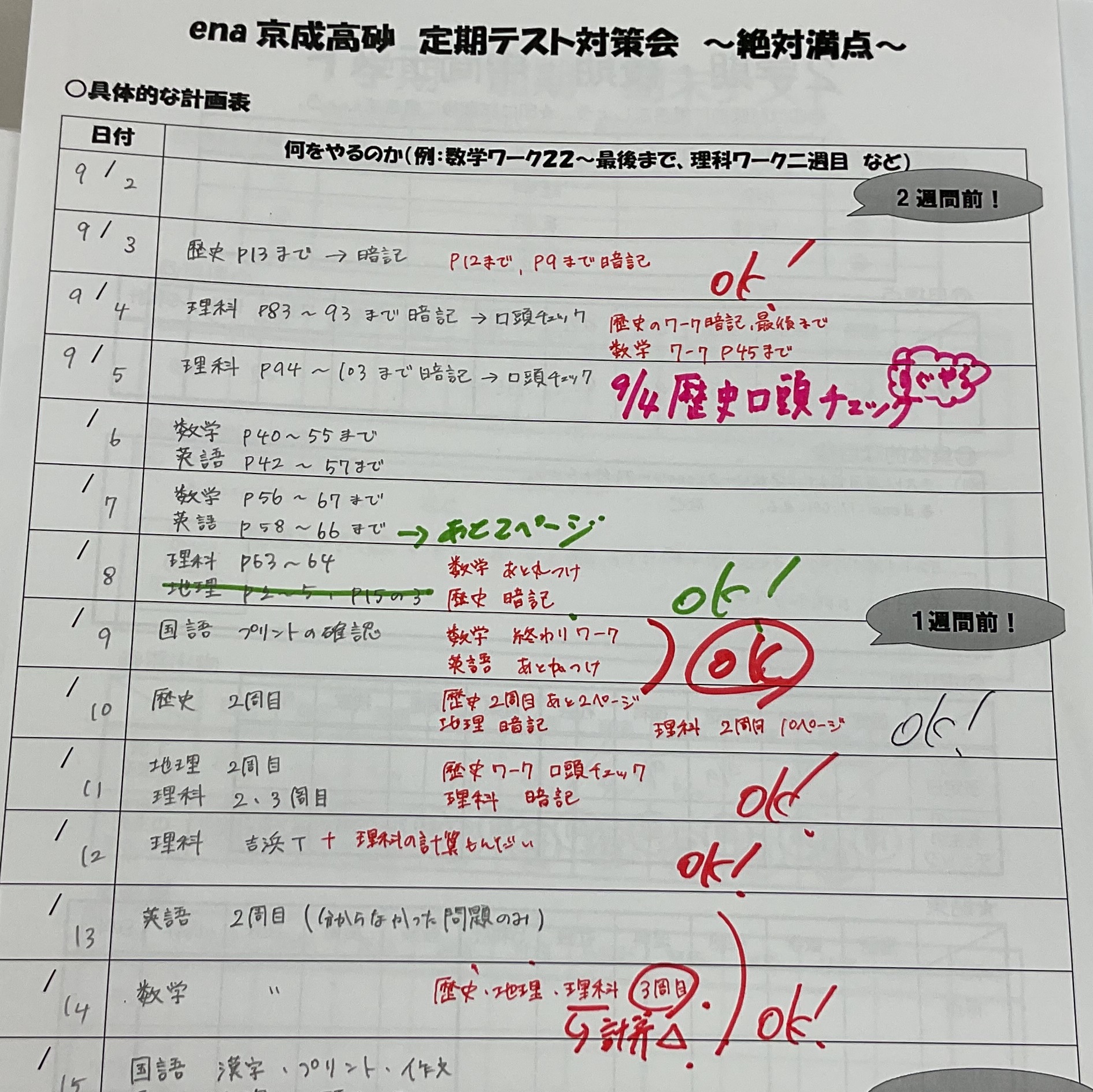 また点数の上がる生徒たちがどのような計画表を立て、