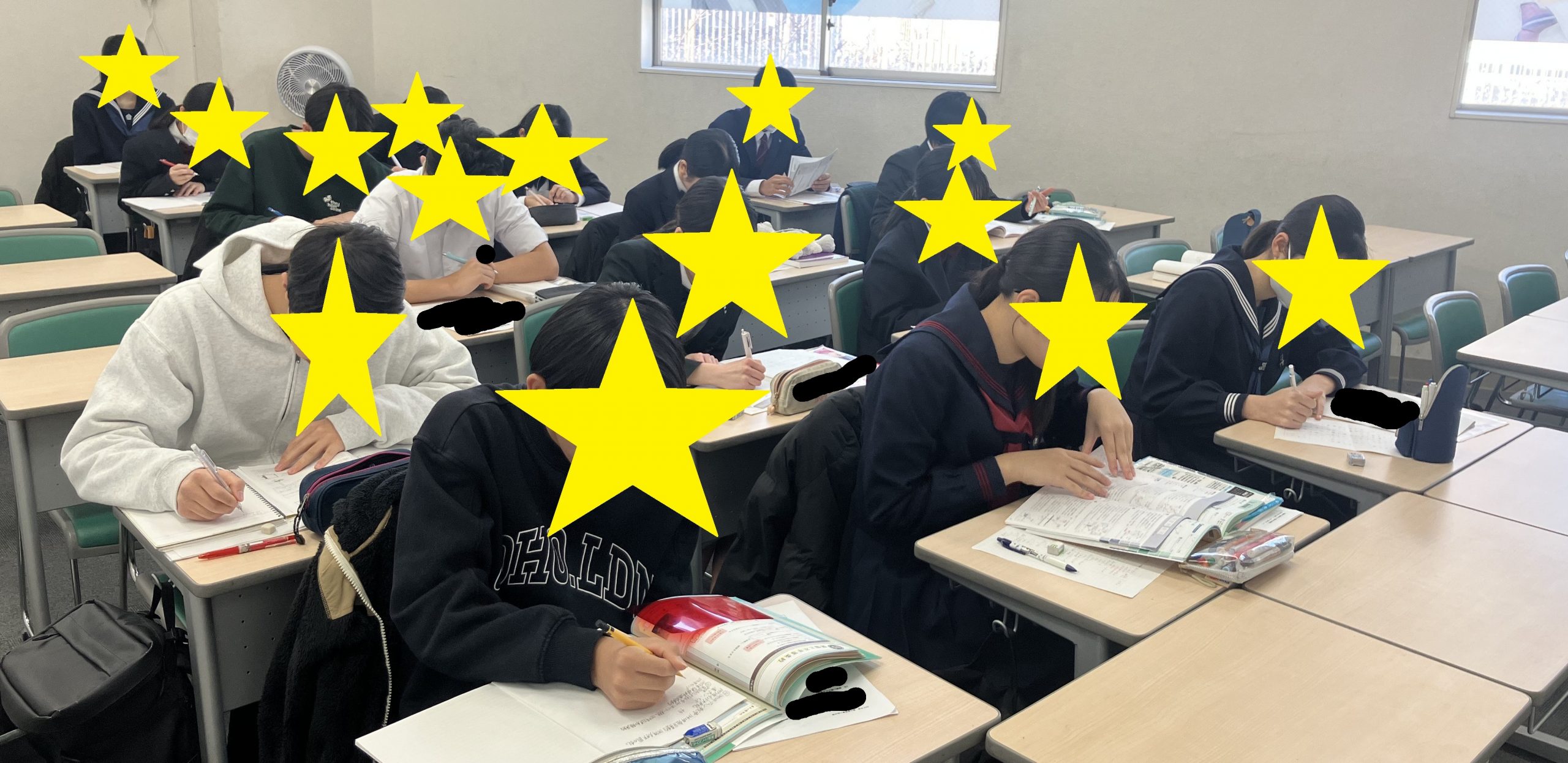 面接を待つ生徒も各自持参した自習道具で時間を無駄にすることなく有意義に過ごしています。1秒も無駄にできない時期です。さすがの集中力ですね。