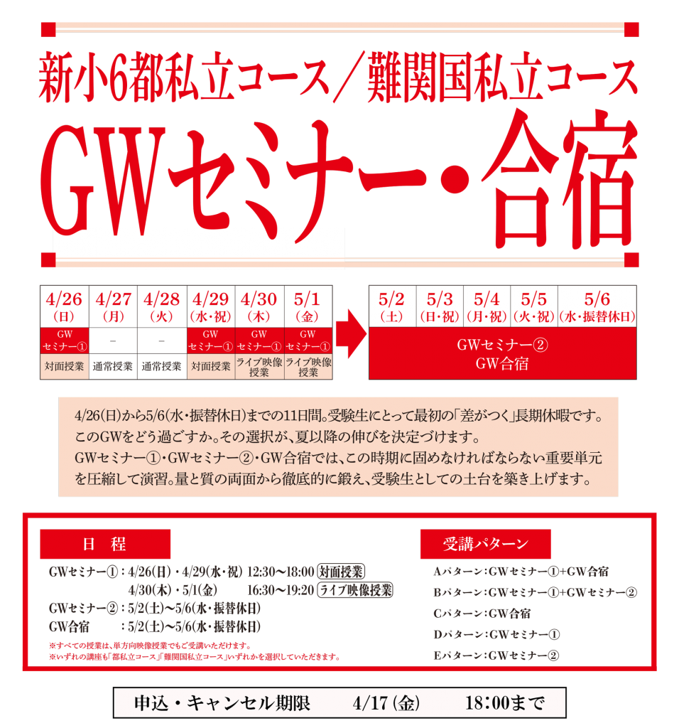 小学6年生および中学3年生、次に向かう先は、GWです。GWセミナーGW合宿も制するために、この4月本科をどう乗り越えるかが重要です。これらに照準を合わせ、春期講習会後であろうとフルスロットルで日々頑張っていきましょう!