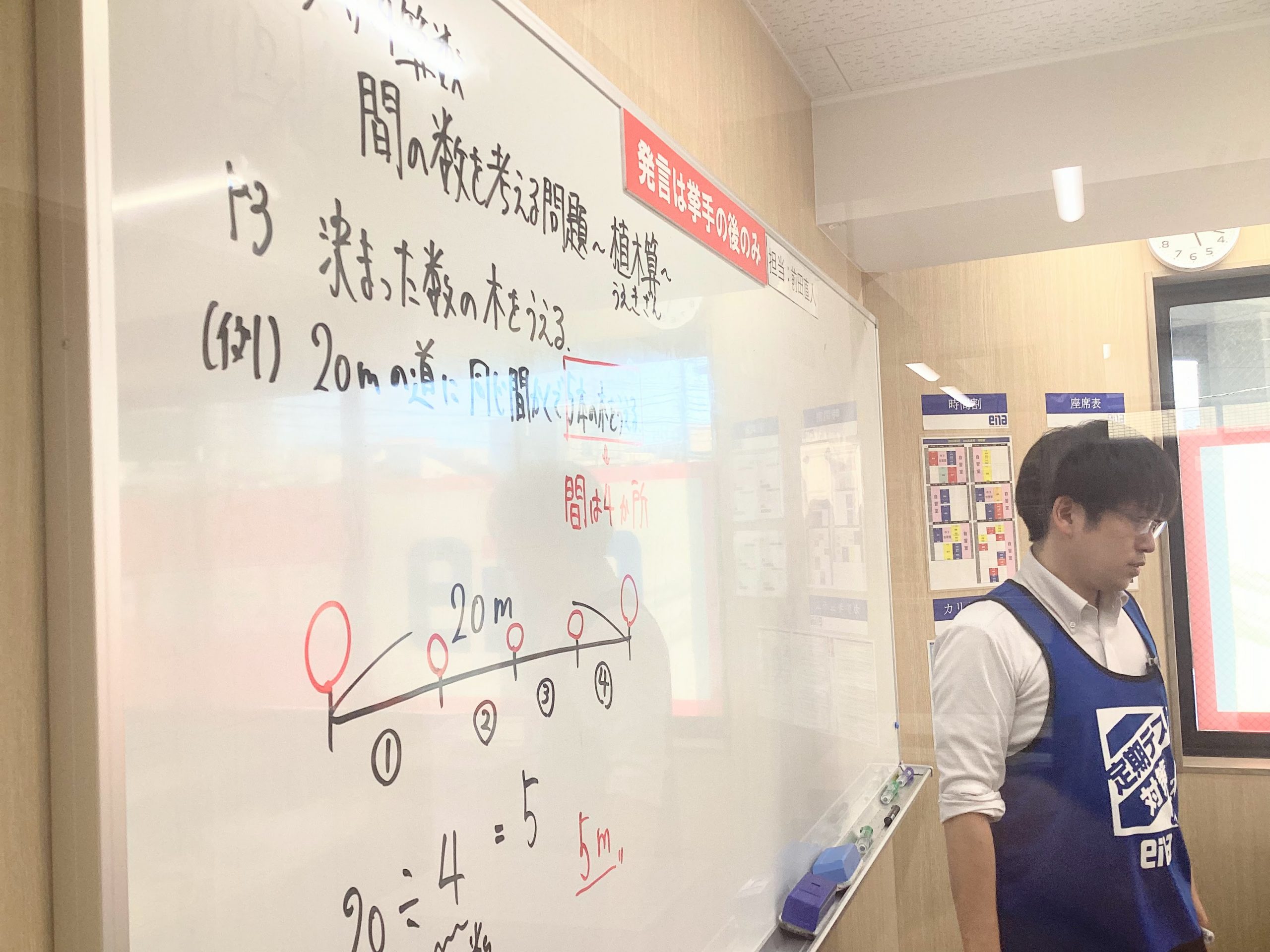 今日は植木算です。植木算は本当に大切。手の指を見て、木の本数と間の数の関係を確認。