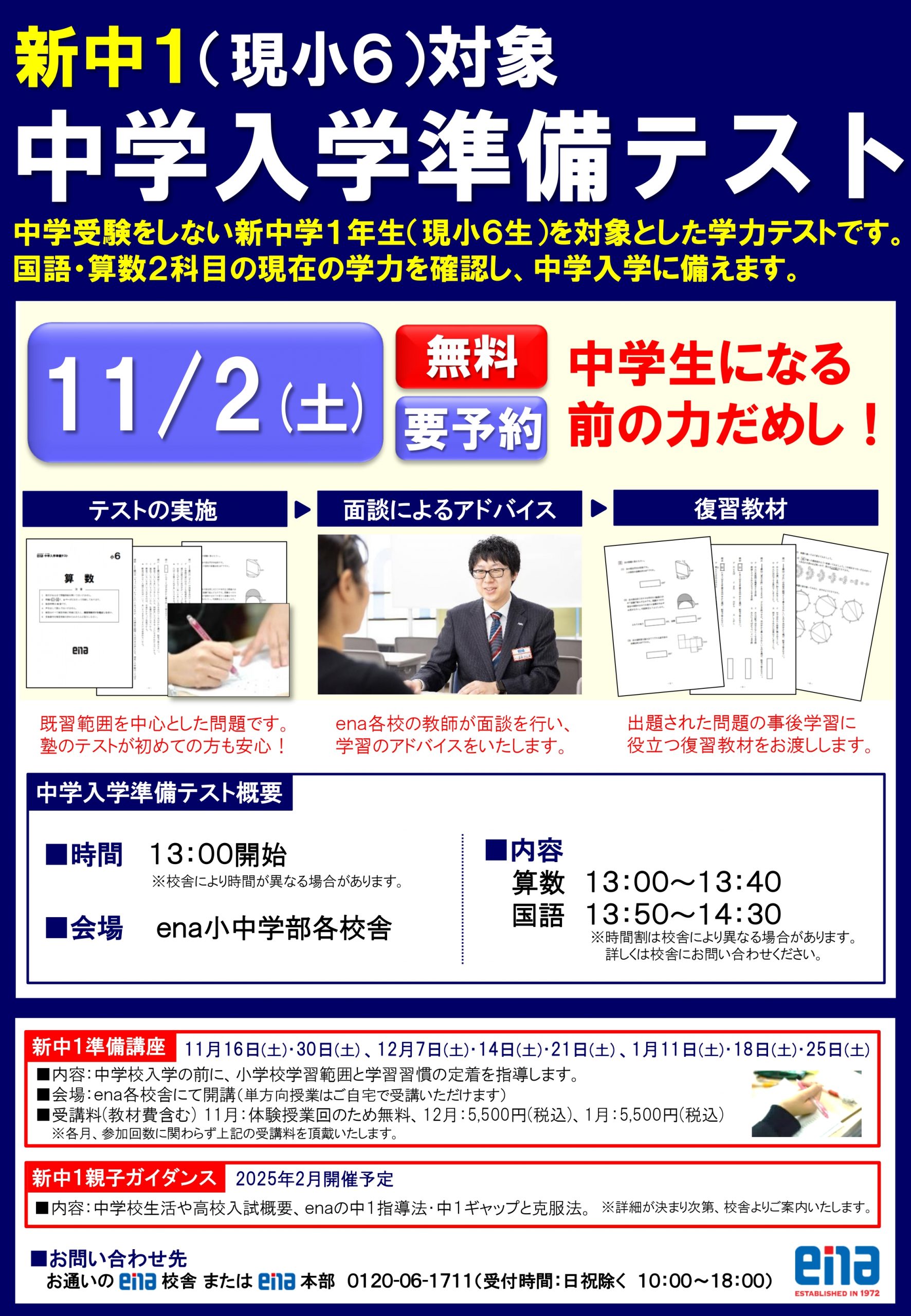 新中1準備講座に先立ちまして、11月2日(土)には「中学入学準備テスト」を行います!