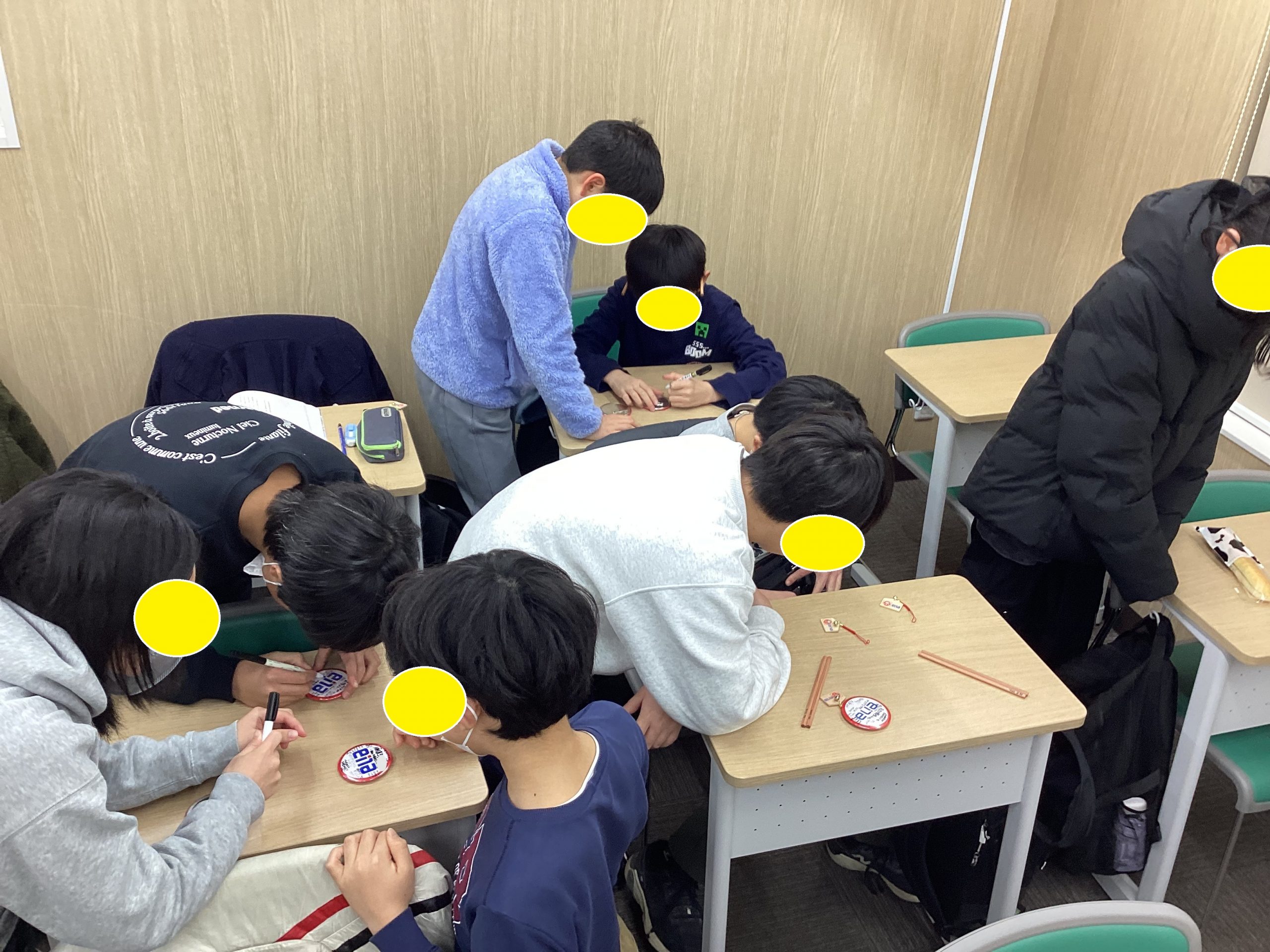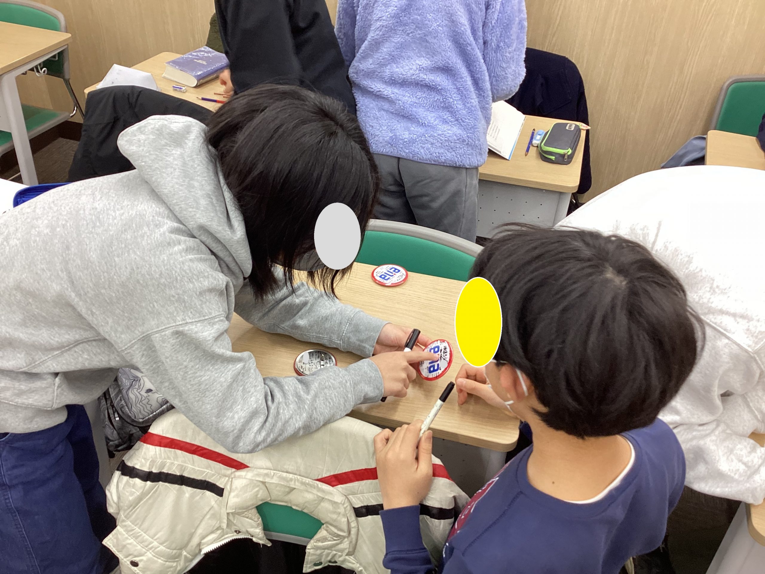合格缶バッヂにメッセージを書き合いました。