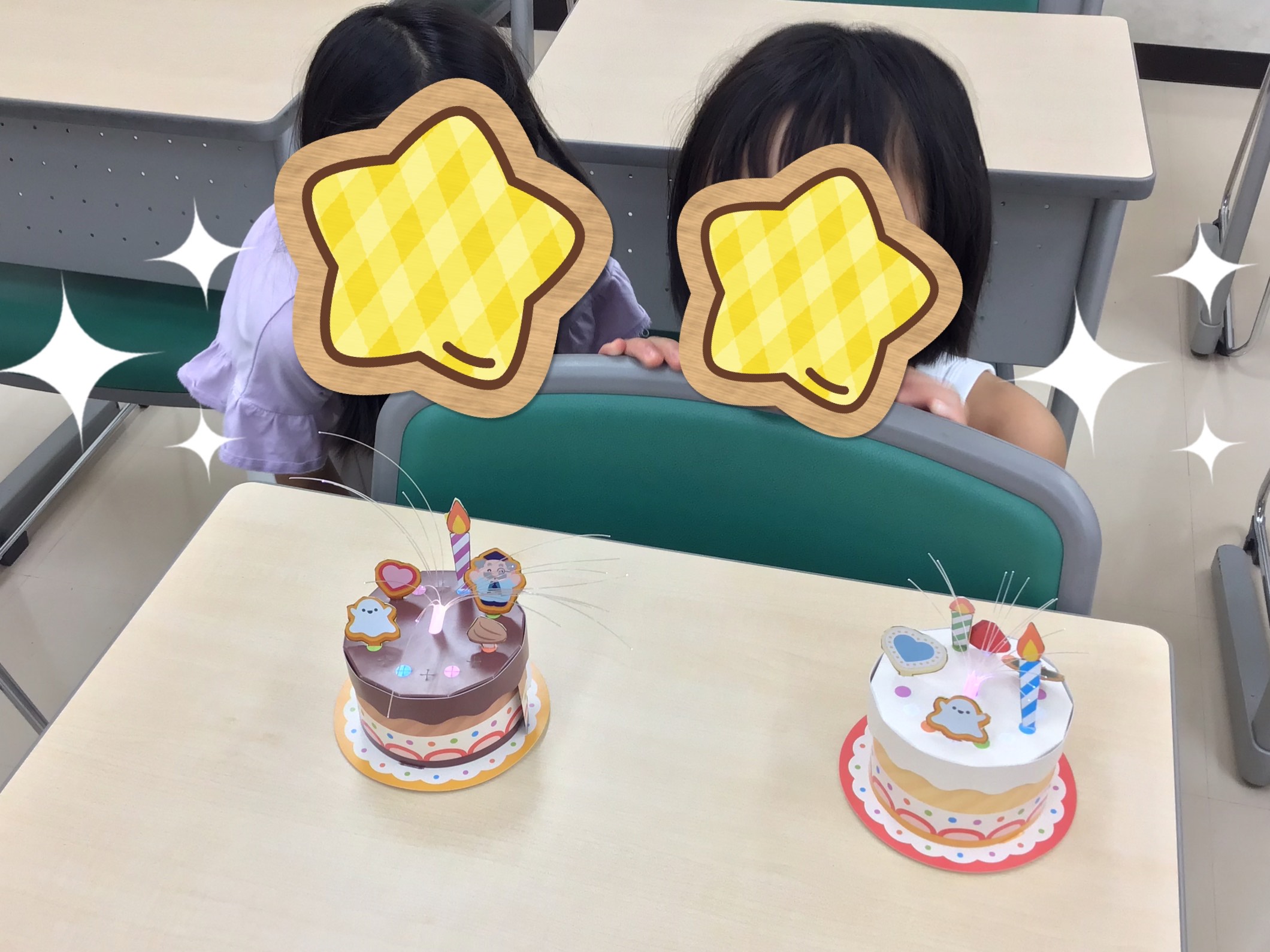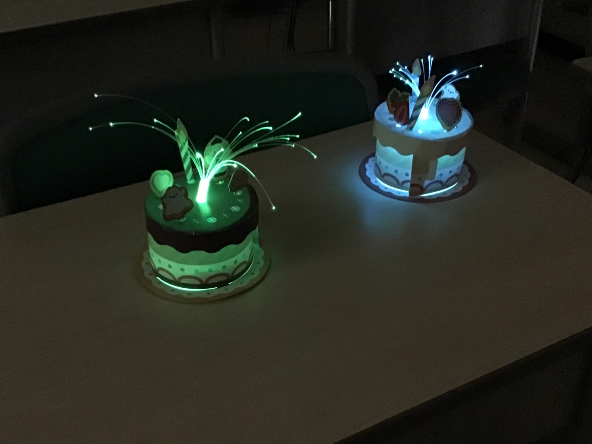 教室をまっくらにして、ケーキを光らせてみました。
