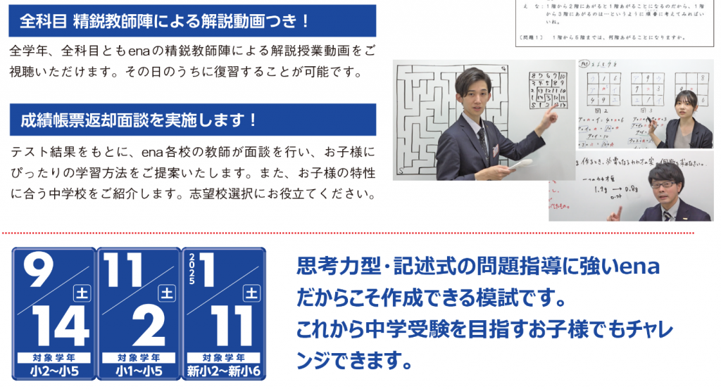 都私立中判定模試は、都立中合格実績No.1のenaだからこそ作成できる、思考力問題・記述問題対応型の模試です。