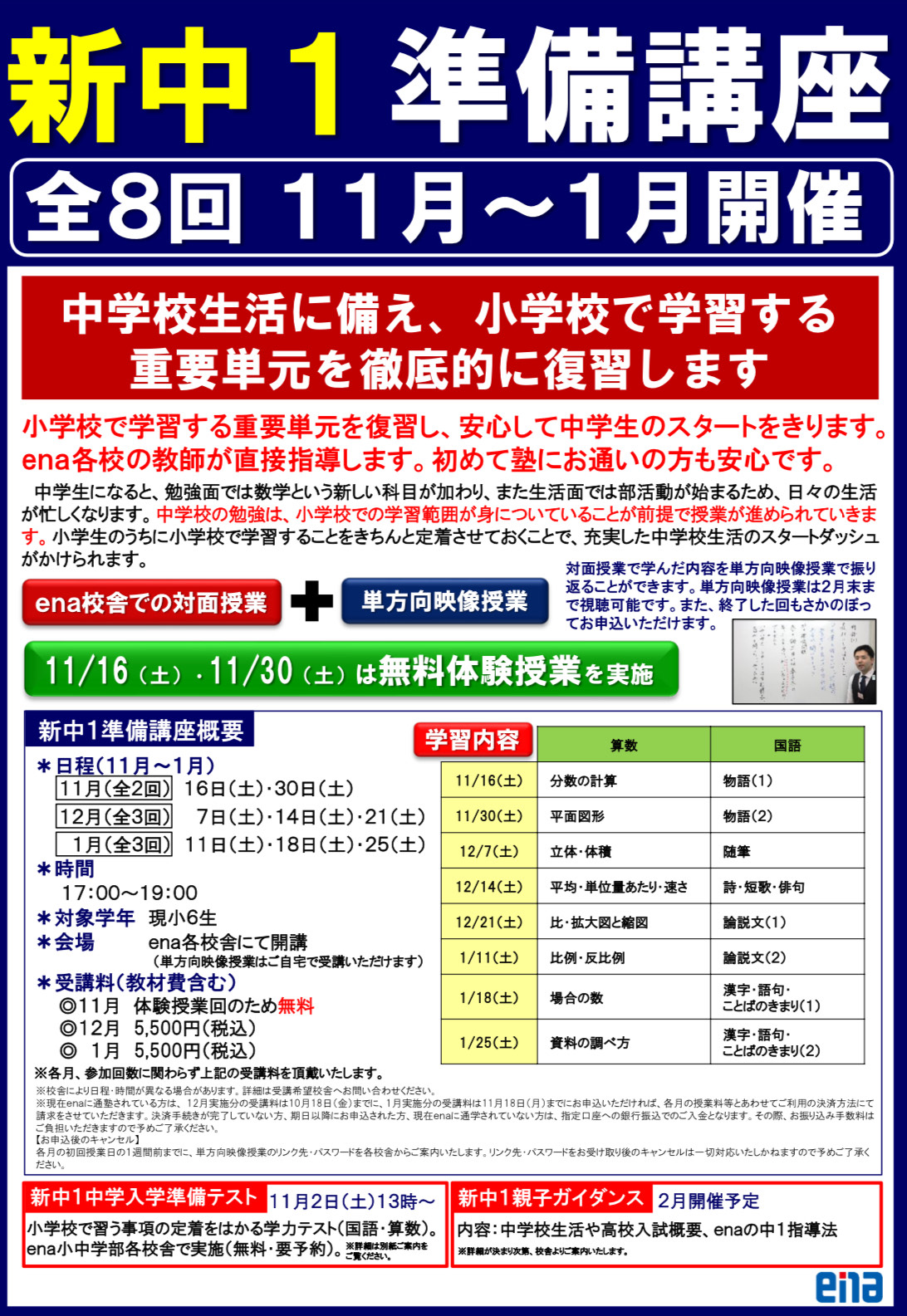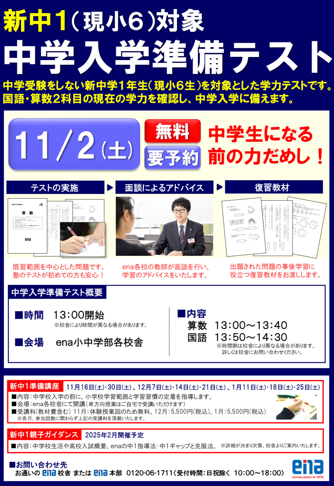 面談の際に、今後の勉強の方針高校受験の概要の紹介、中学入学後に勉強と部活を両立するための秘訣等、ena平和台でしか聞けないお話をさせていただきます。