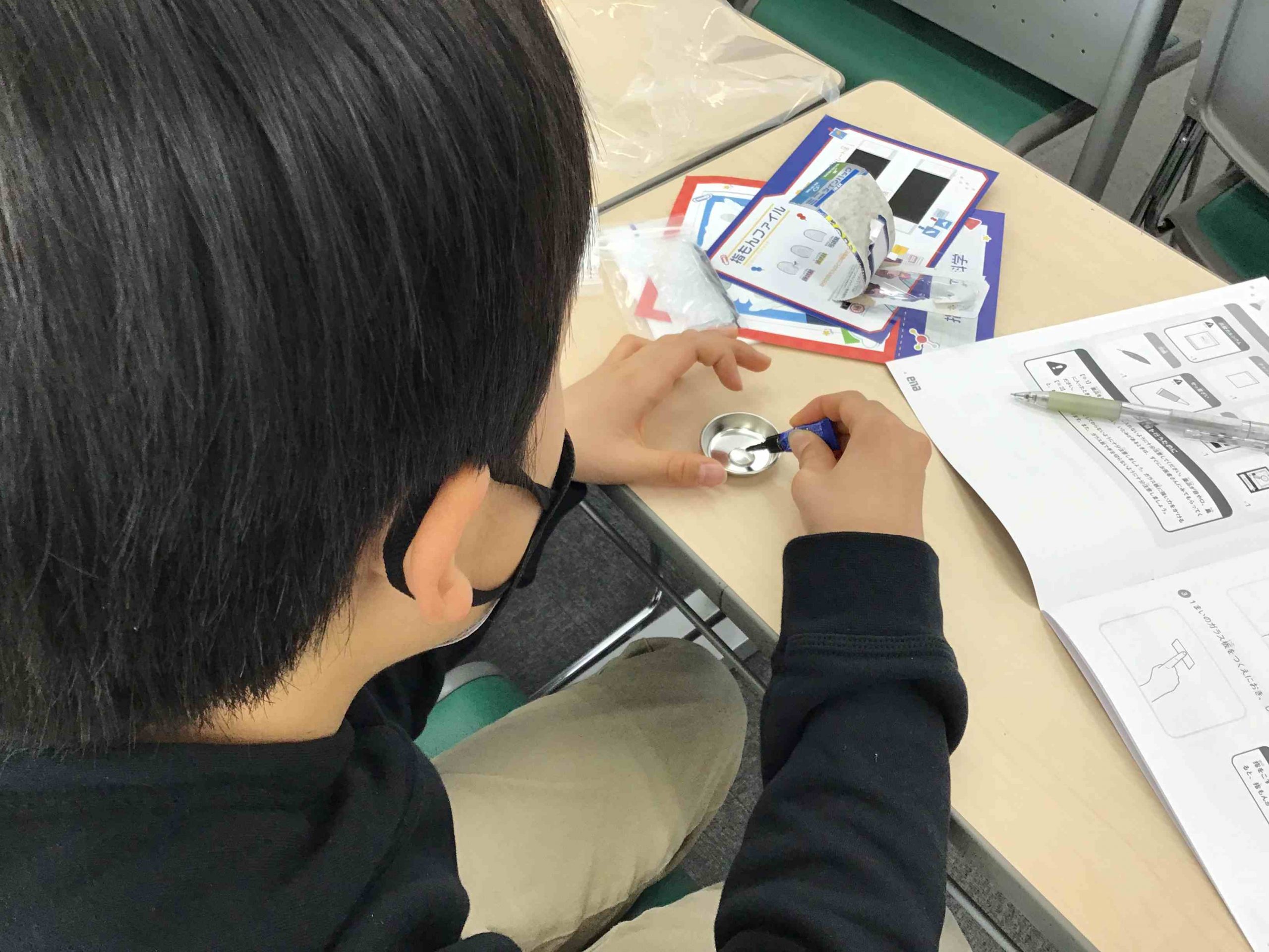 今回のふしぎ教室では、スライドガラスにつけた指もんを(これから紹介する2つの方法で)浮かび上がらせ観察をしました。