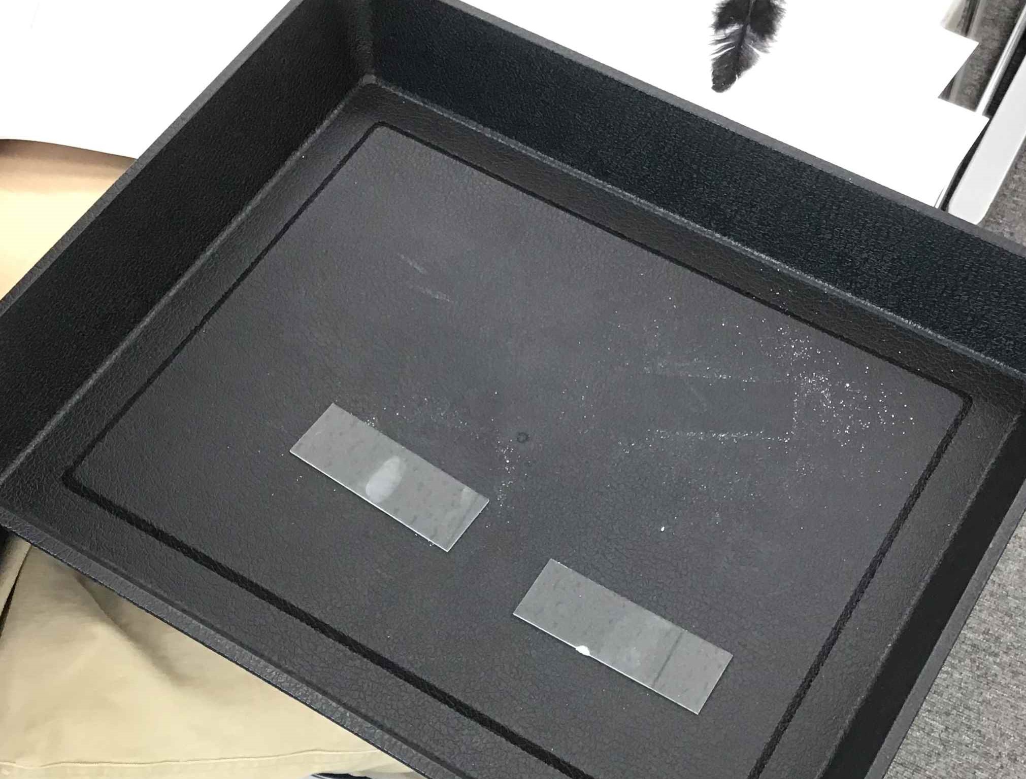 ガラスに押しつけた指もんには水分が含まれるので、シアノアクリレートと反応して指もんが白くはっきり見えるようになりました。