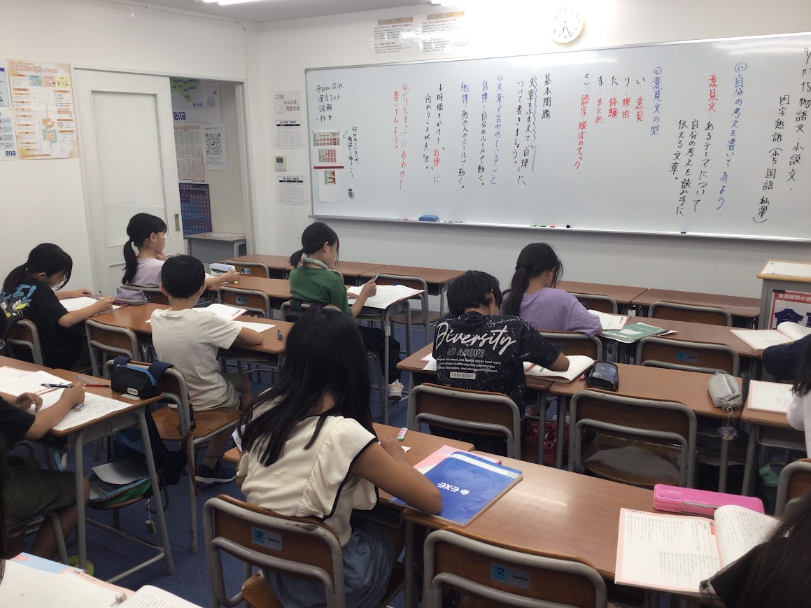 写真は小5の国語。意見文の書き方に習って、作文演習を行っております。