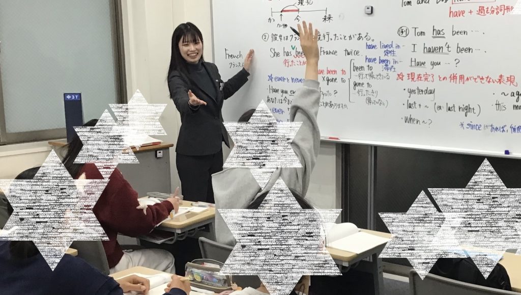 ▼中3の英語の授業。本科授業でやった内容の復習に加え、入試問題を想定した発展的な内容も扱っていきます。