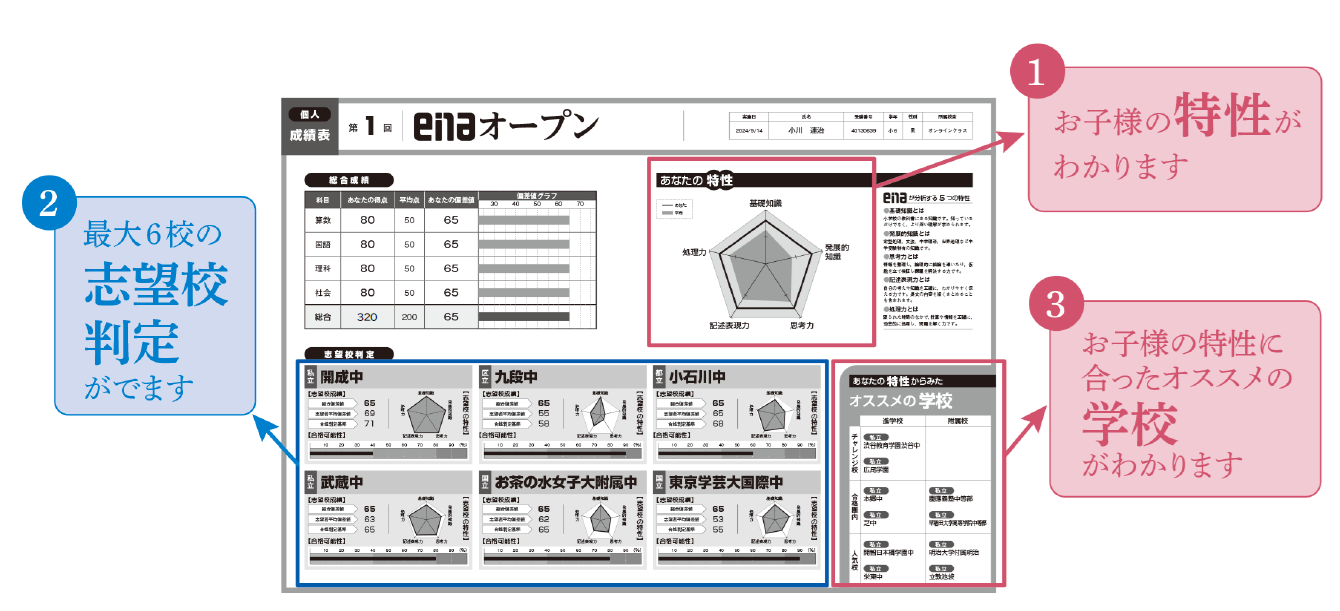 また私立中、国立中、都立中の中から最大6校の合格判定も載せた成績表をプロの校長より今後の学習のアドバイスと共にお渡しいたします。