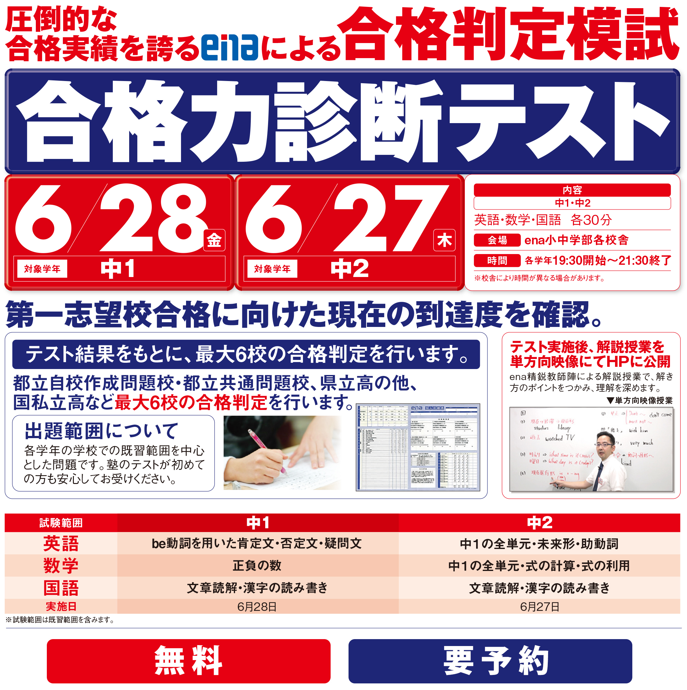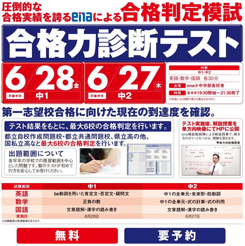 このテストはenaにお通いではない方も受験が可能ですので、是非一度腕試ししてみませんか?