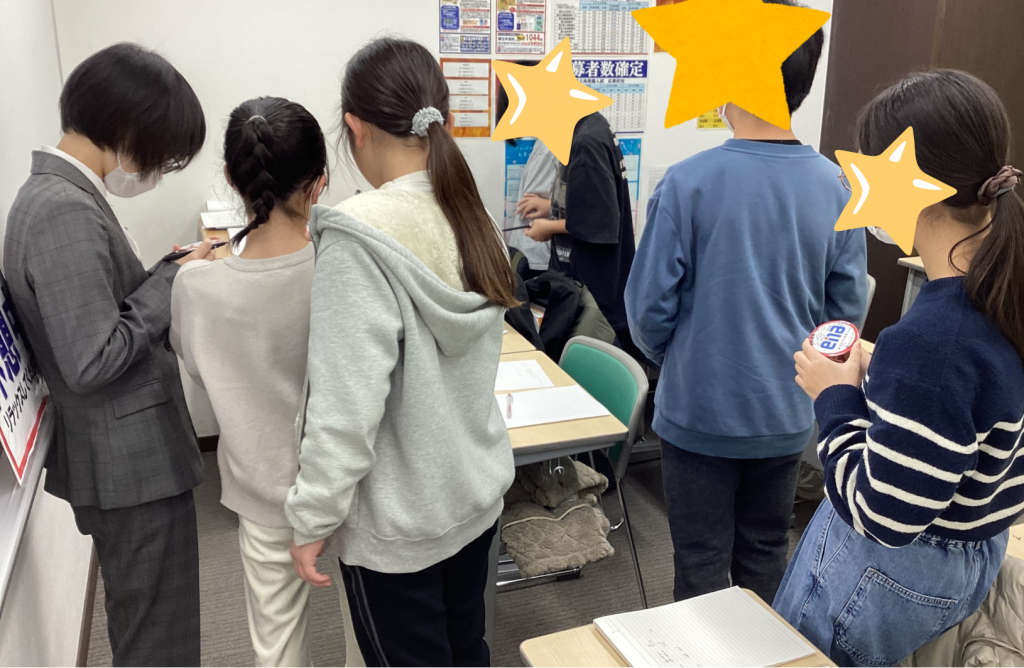 本日の休憩中の様子、「小6理系担当」の山本先生に生徒が群がっています。