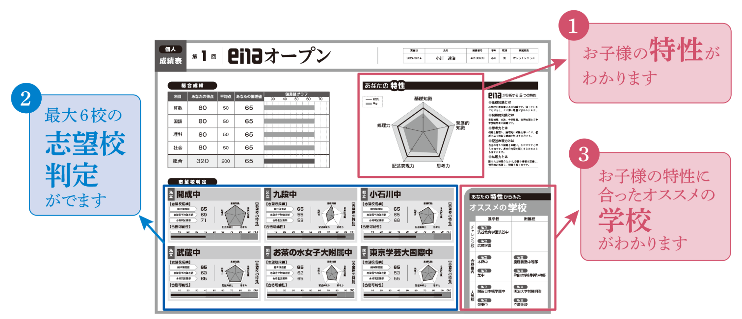 お子様の特性が分かりますので志望校がまだ定まってない方々にも非常におすすめとなっております。