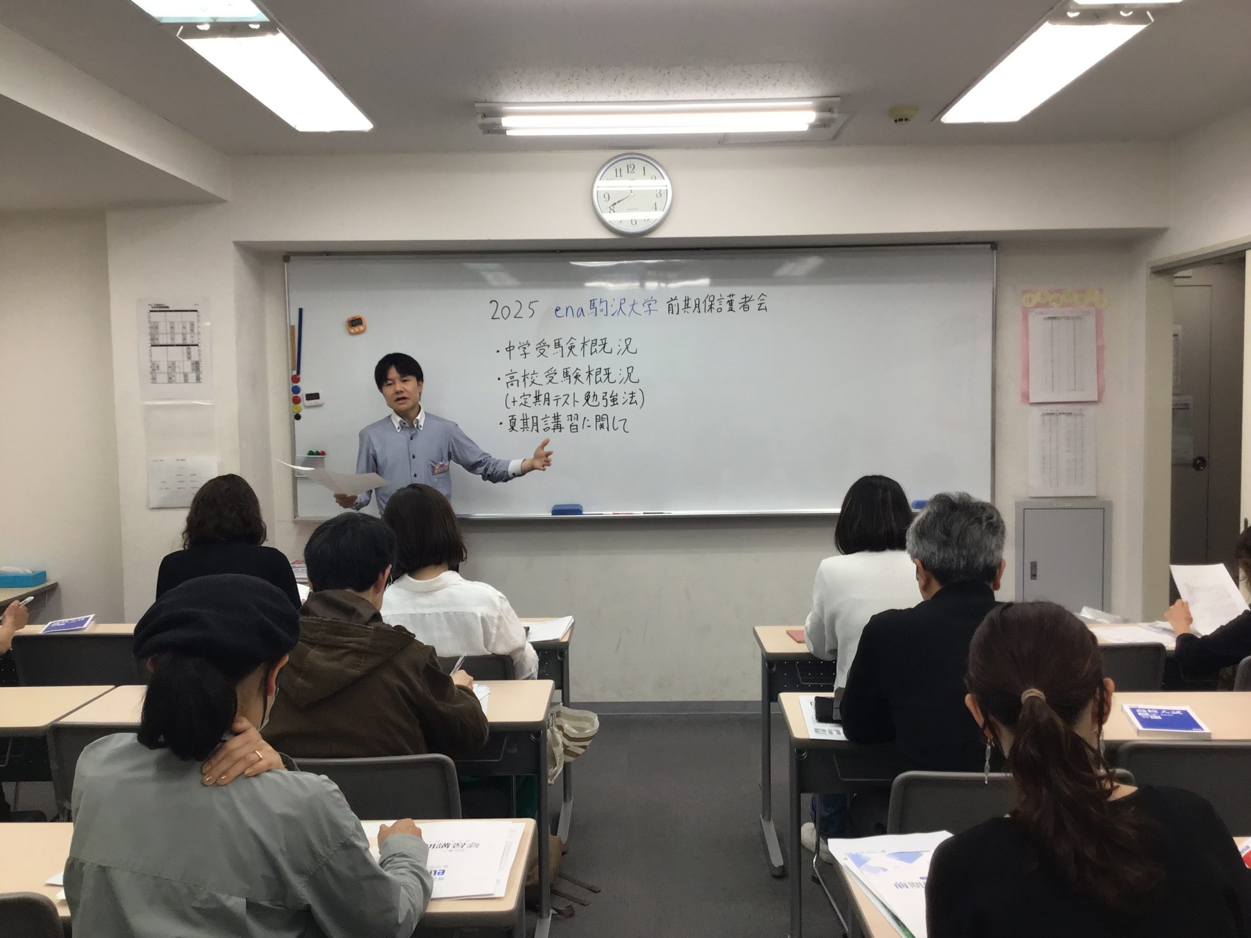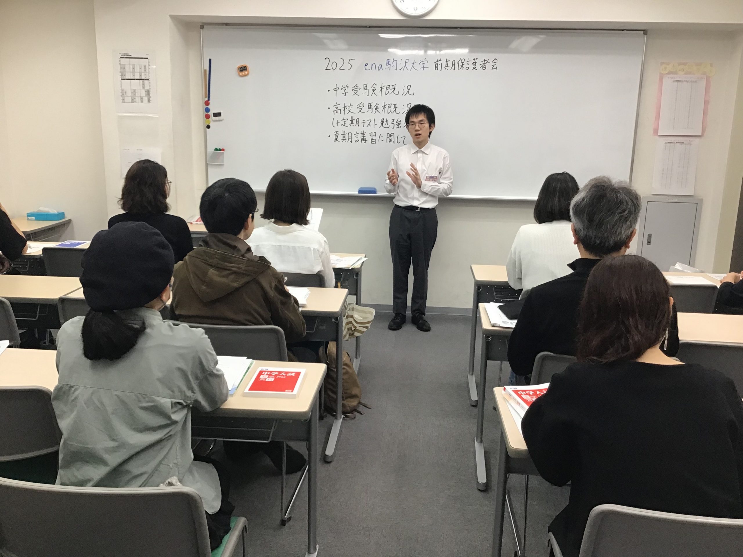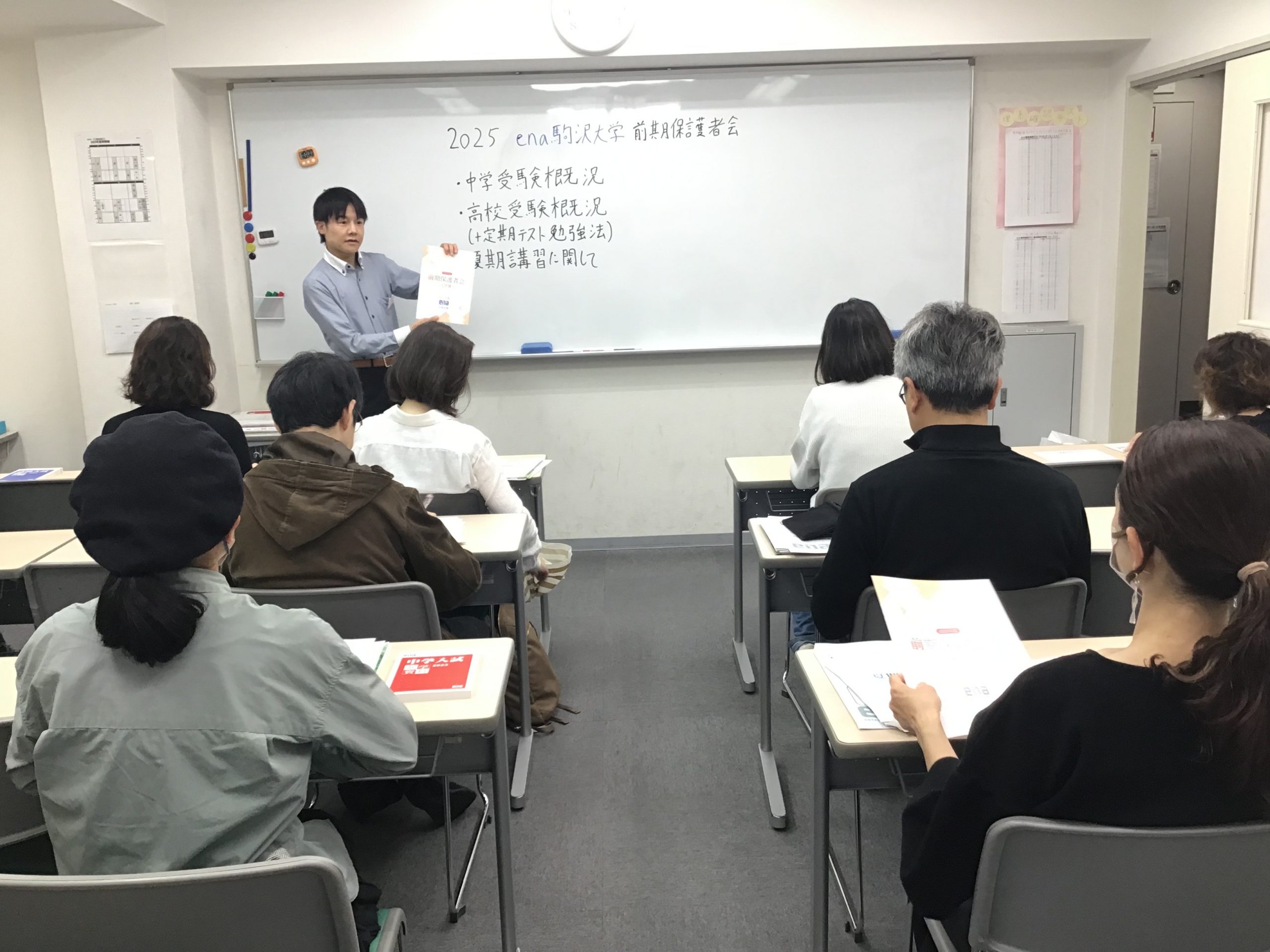 保護者会では校長の吉永が登壇して、enaだからこそ伝えられる入試のトレンドおよびenaの取り組み方、また夏期講習のご案内をいたしました。