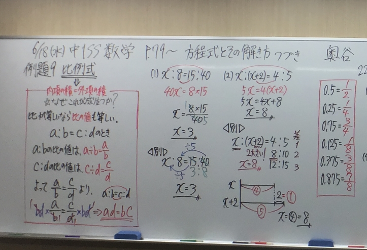 しかも最高水準コースとなるとなかなかに大変です。普通比例式の解き方において紹介されて、あとはそれを使って解くことで慣れさせて終わりとなる「内項の積=外項の積」ですが、勿論証明も含めてしっかりと指導しています。