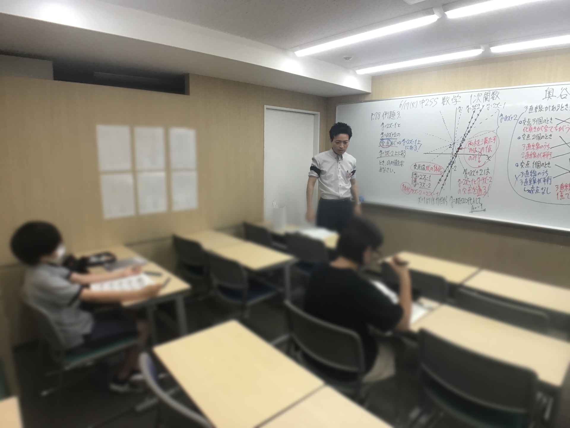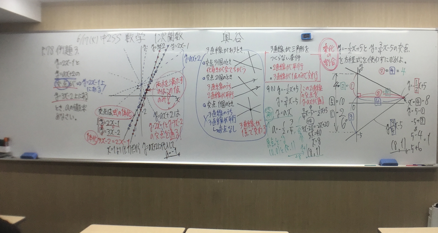 直線の交点って個人的に激アツな内容です。交点ができるできないの感覚と、交点ができる=図形ができるというコンビネーションは相当好きですね。また、交点や直線状にある点というものがどういうものなのかも簡単には種明かしをしません。簡単に種明かしをしてしまうと頭を使わなくなってしまうからです。このご時世、与えられることが多くなっていますが、それでは思考力が育ちませんので都立自校作・国立・難関私立には合格できませんから。