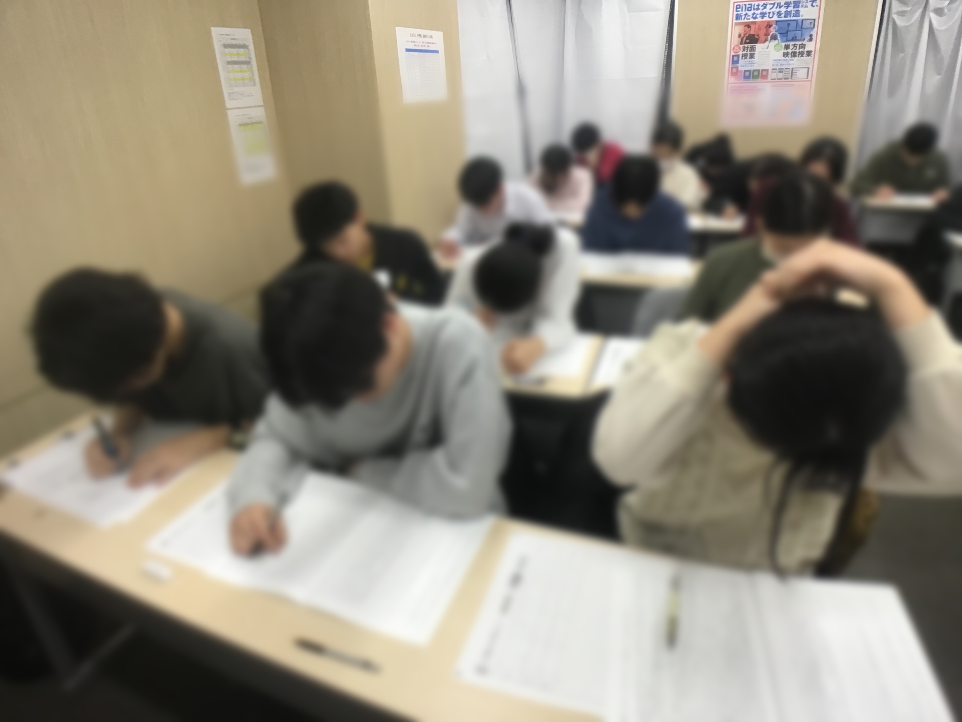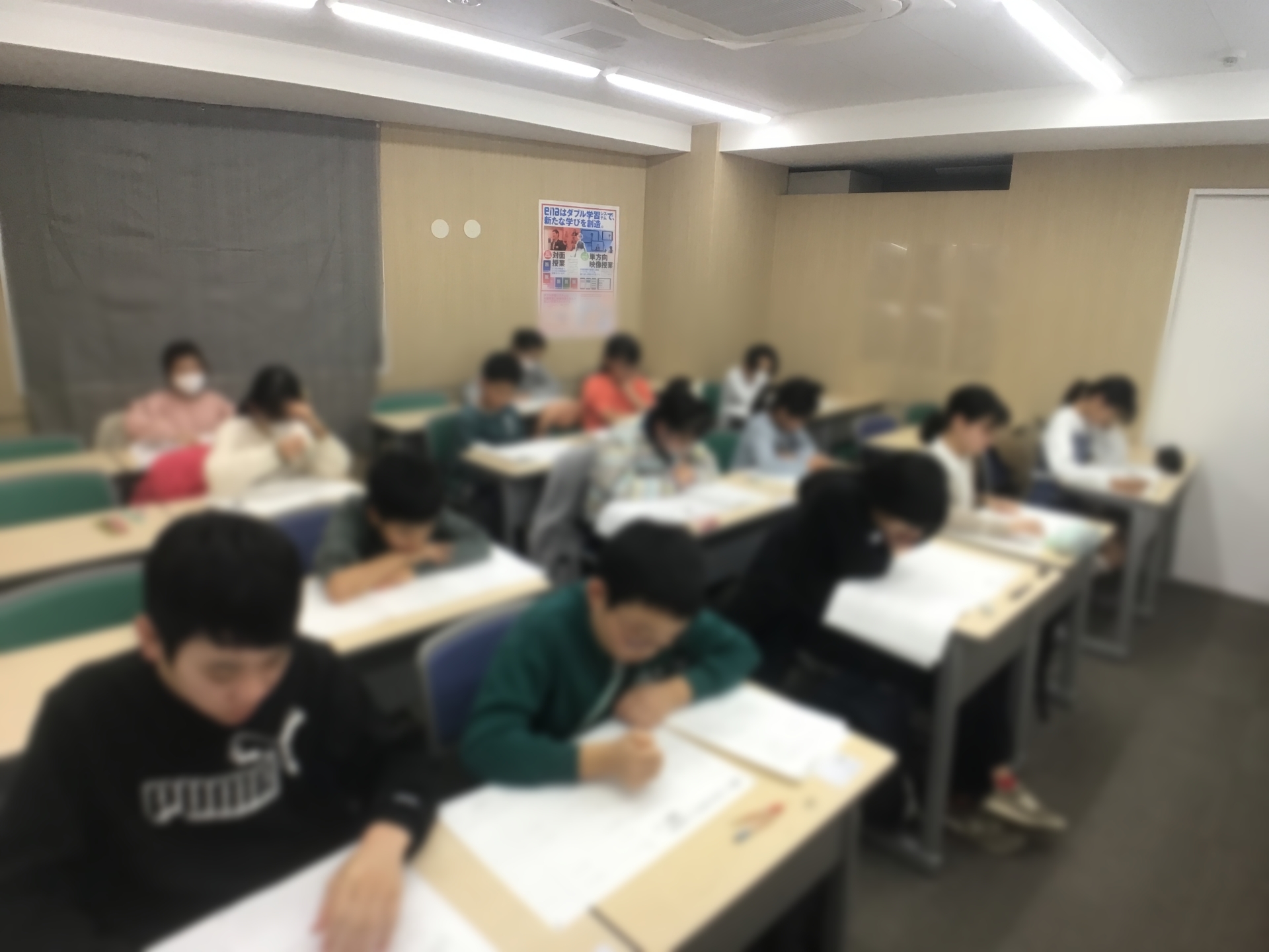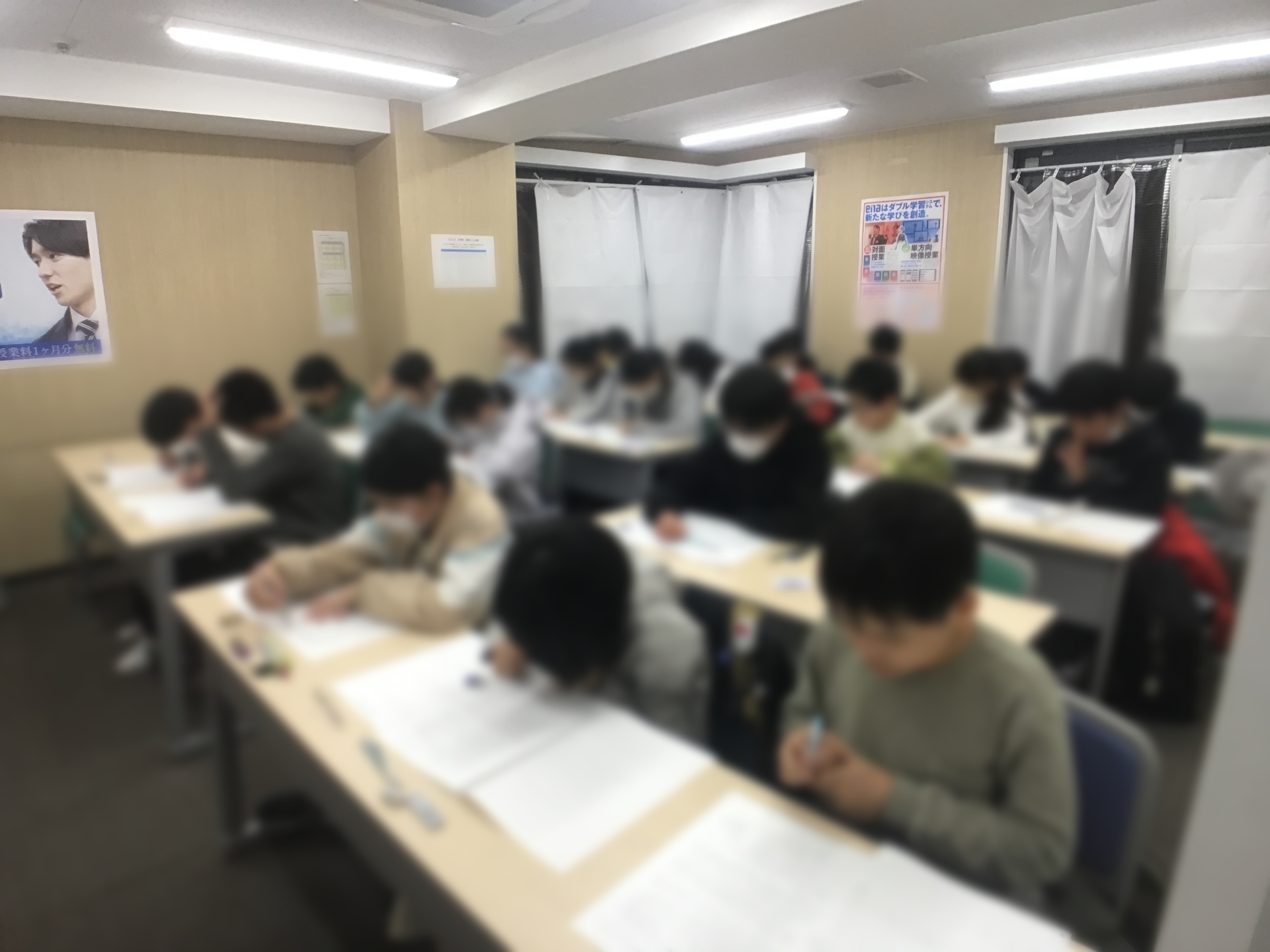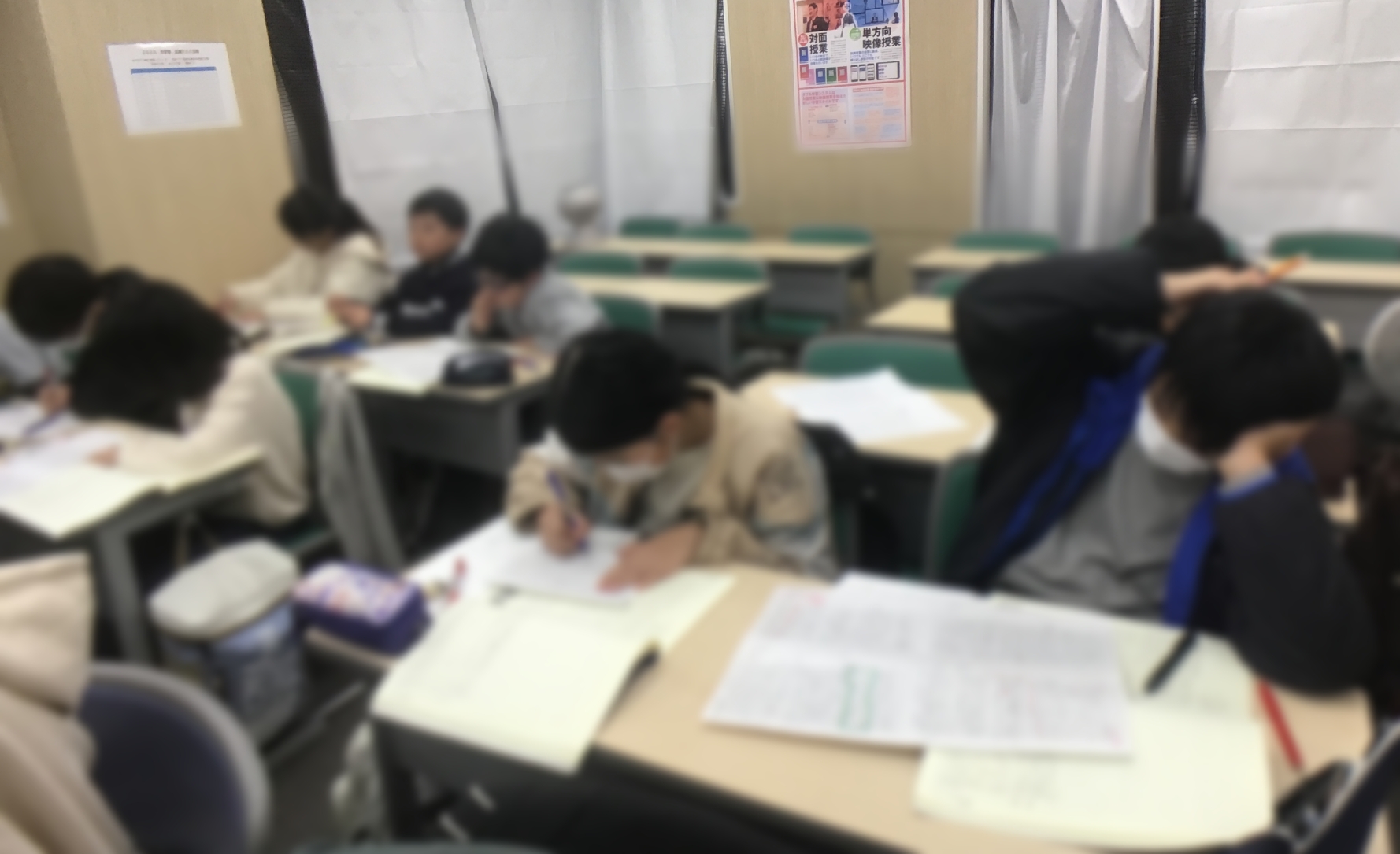 こちらは授業中ではなく自習室の様子です。よくご覧いただくと多くの中学3年生の中に、小学生が混ざっているのが分かります。学年も何も関係ないですからね。