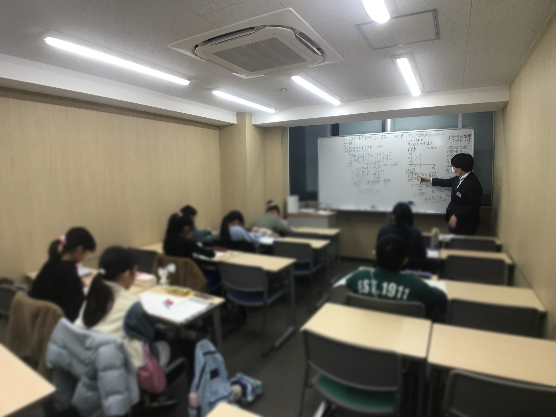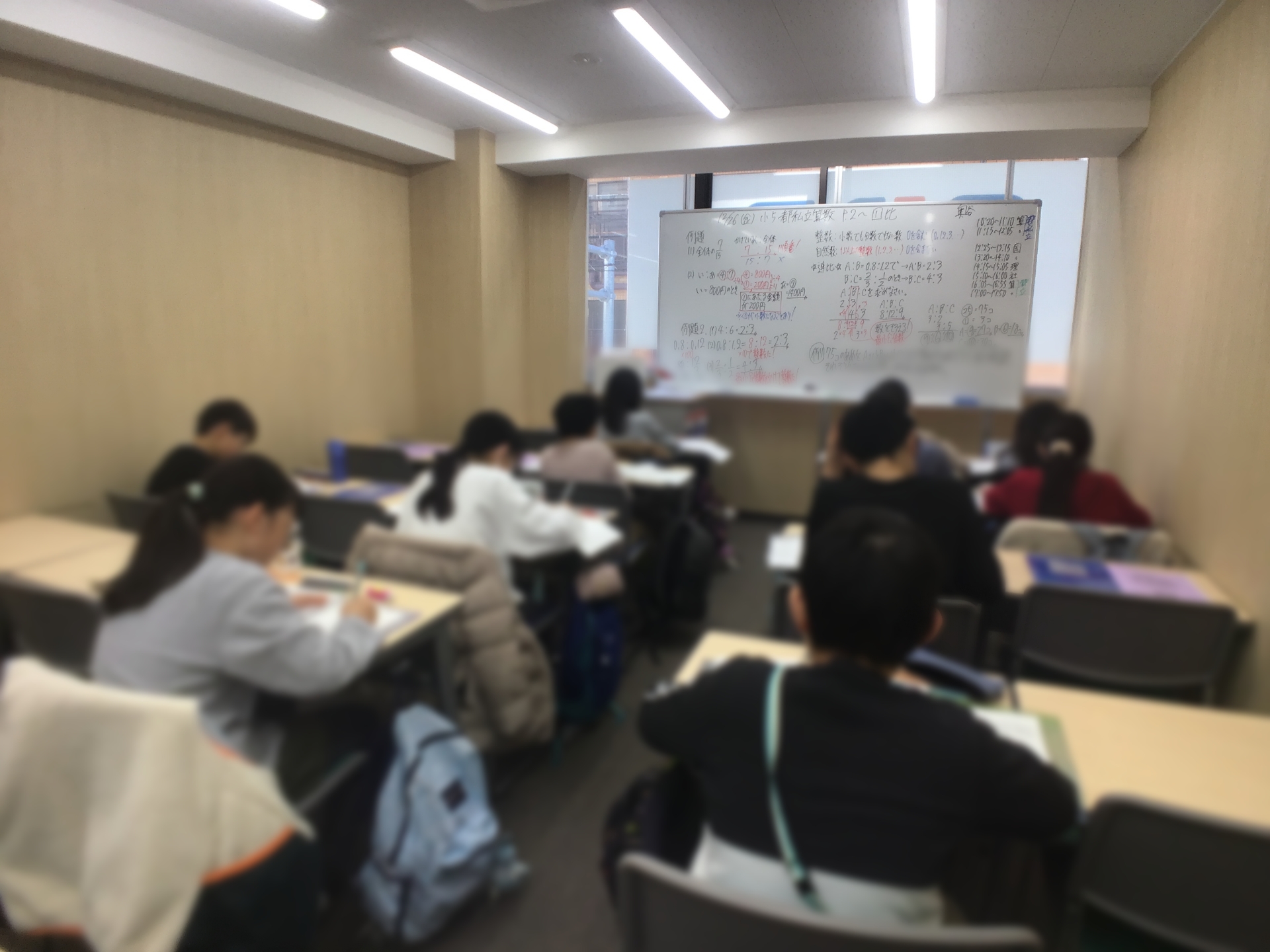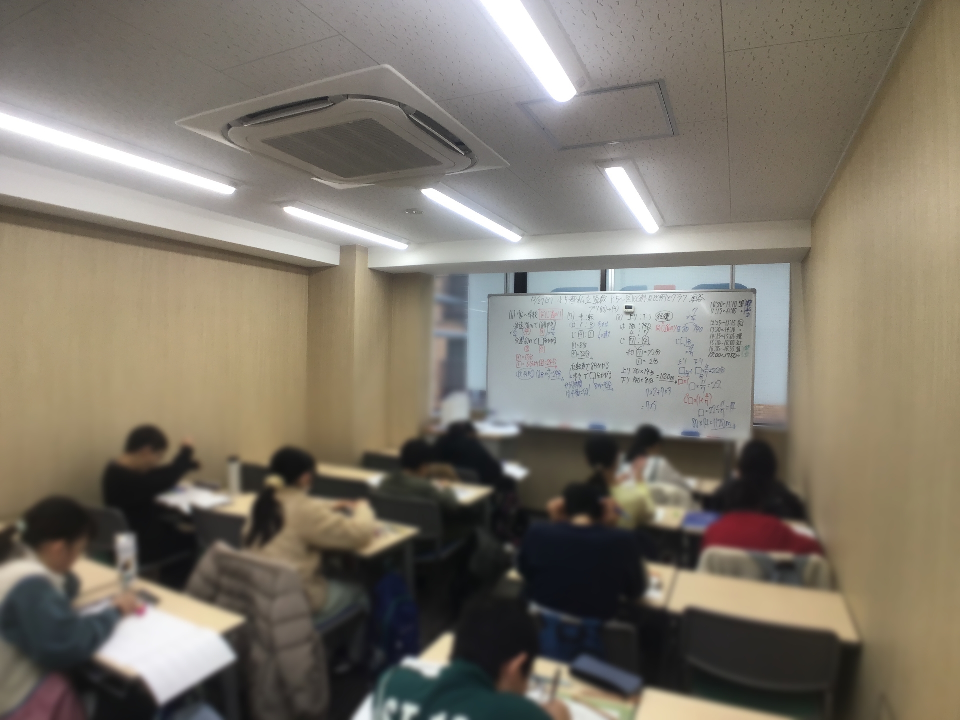 都立コースと都私立コースに分かれての算数では、比や比例・反比例を扱いました。子どもたちに「比例・反比例と言ったらあれだよね?」と問いかけると即座に反応し、速さの別プリントもやりました♪