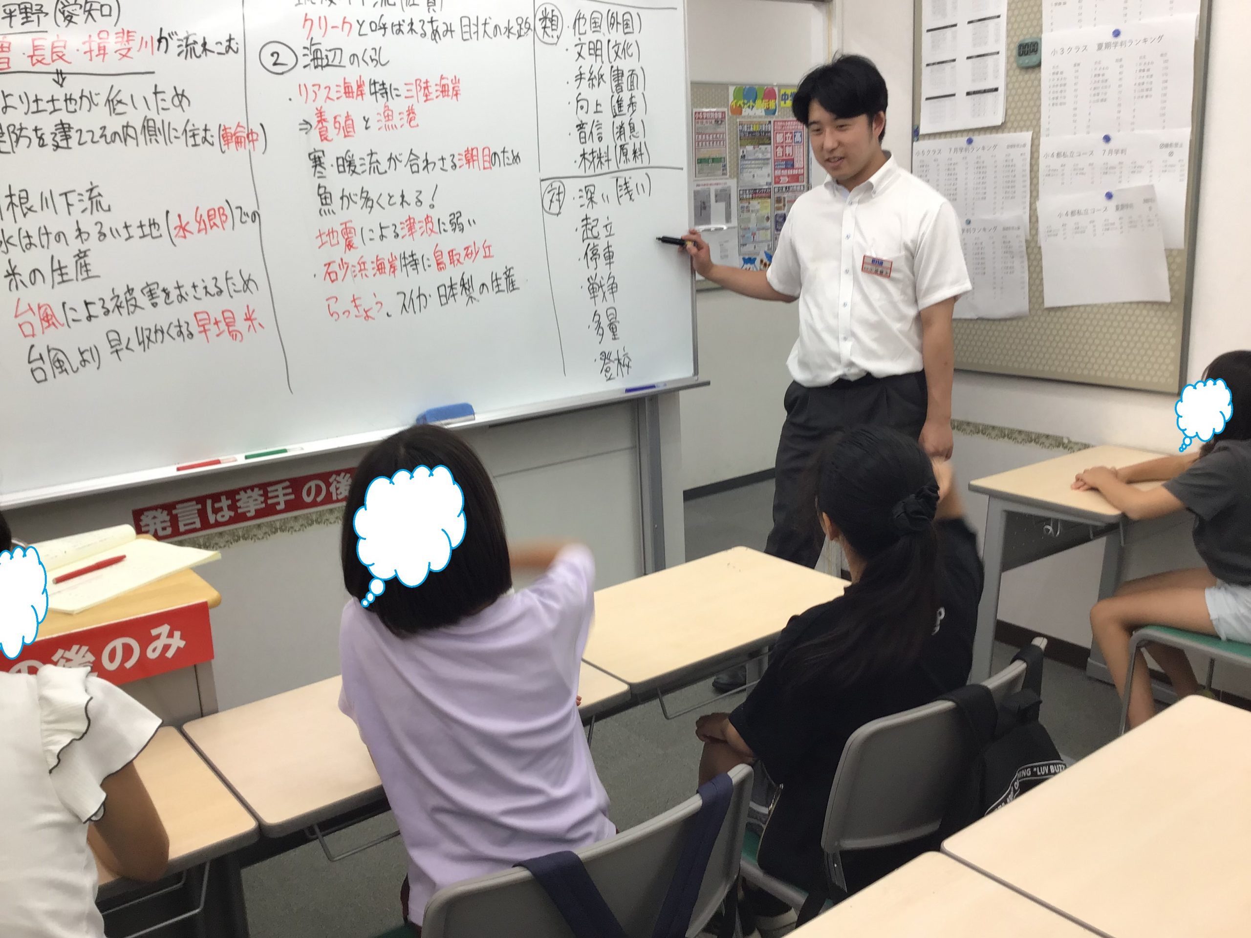 (^^♪ 授業がすごく楽しかった。大地の変化や地層、天気など基本的なところを最初に説明してくれたのですごく助かった。一番苦手だった大地のところが少しずつ解けて、解けていなくても解説を聞いて理解できるようになったのが嬉しかった。板書も見やすくて、この合宿の中で一番印象に残った授業でした。