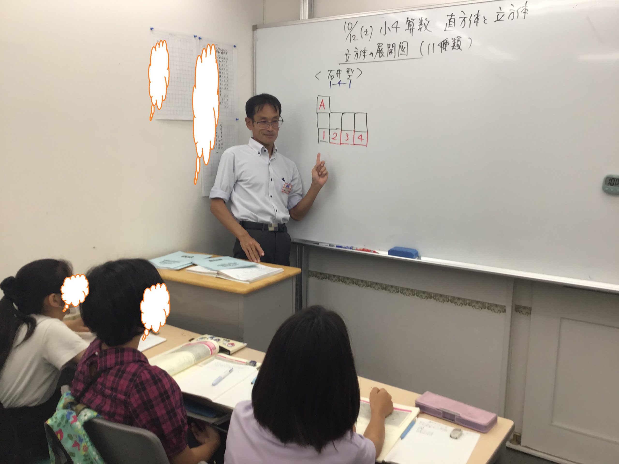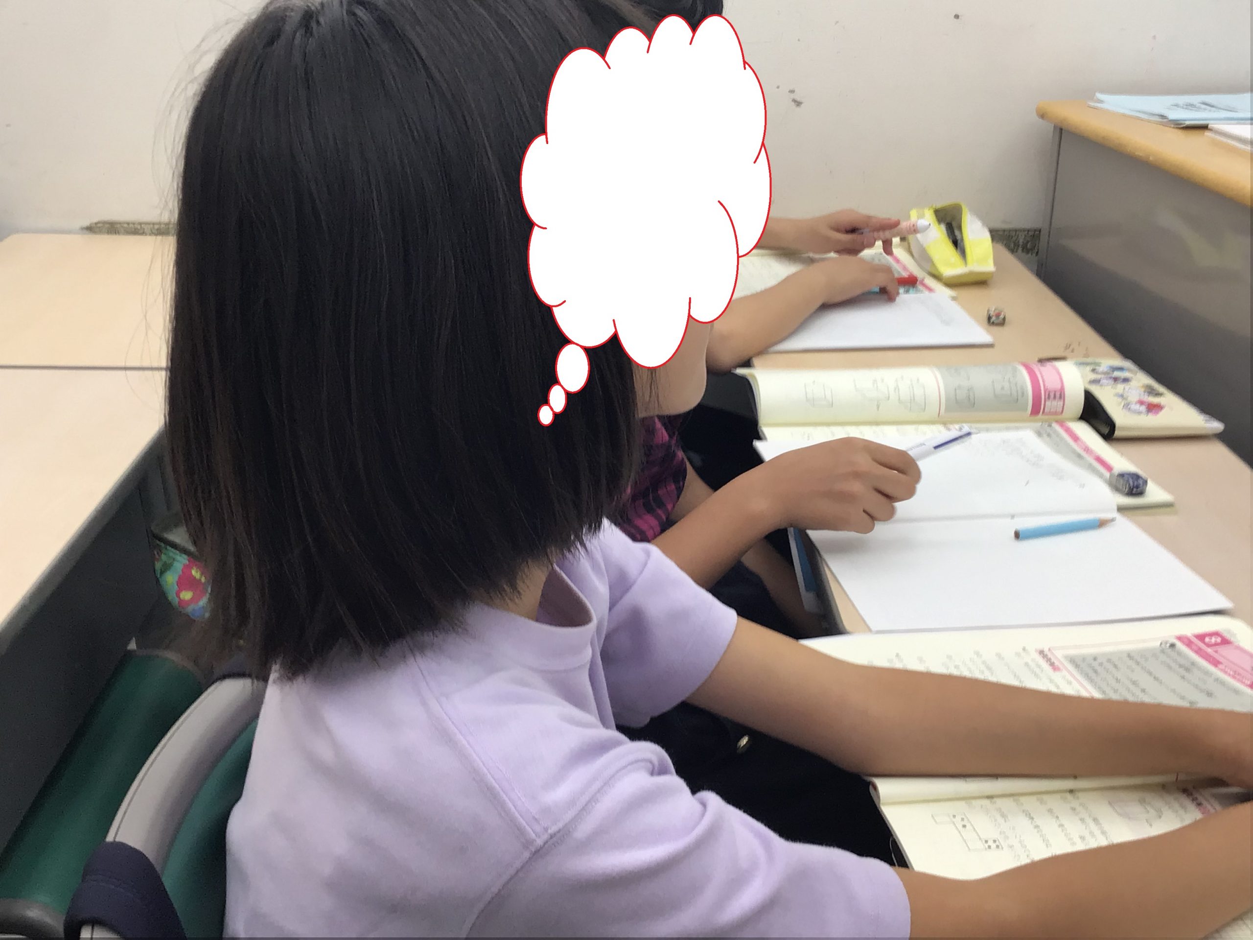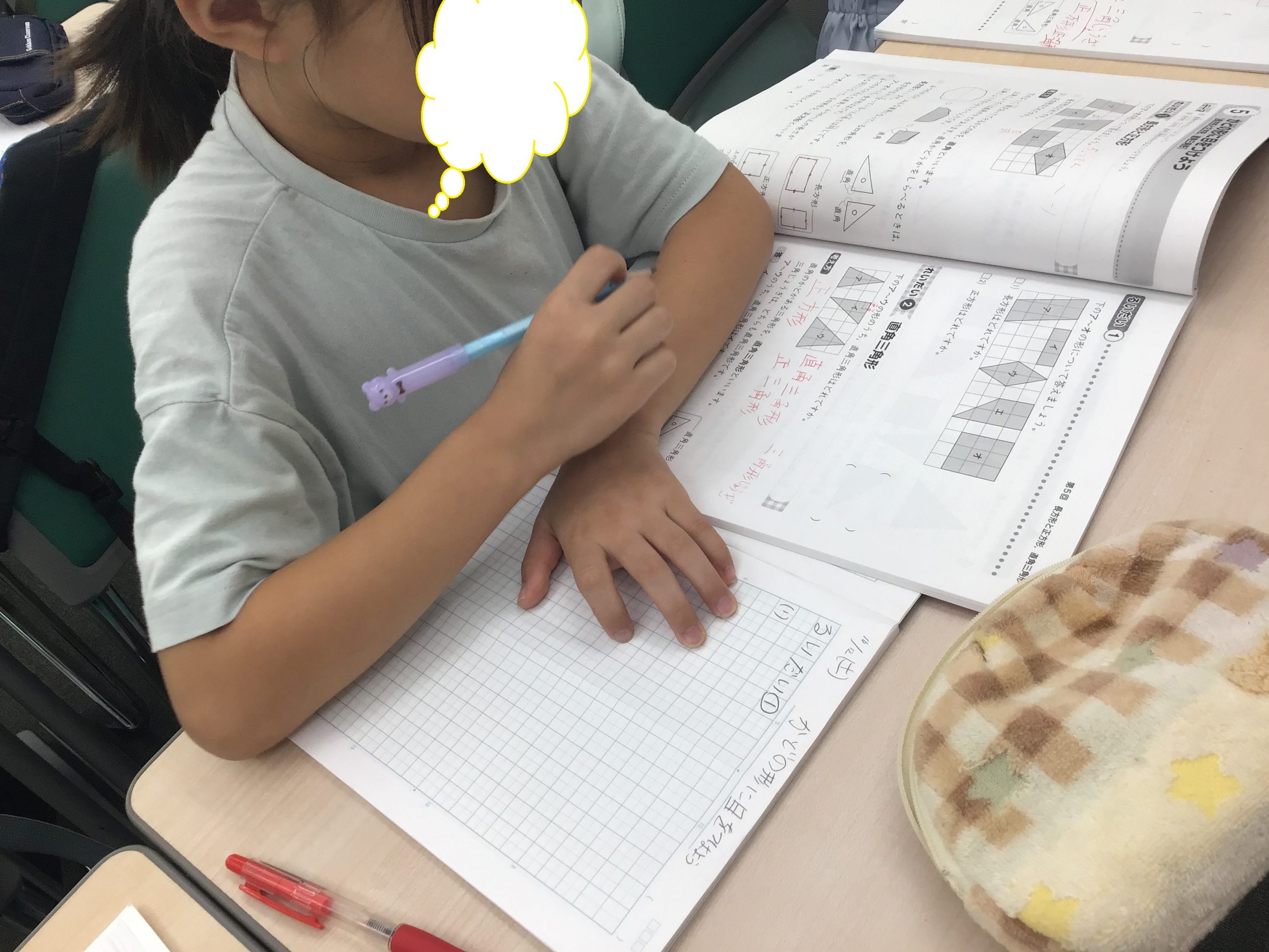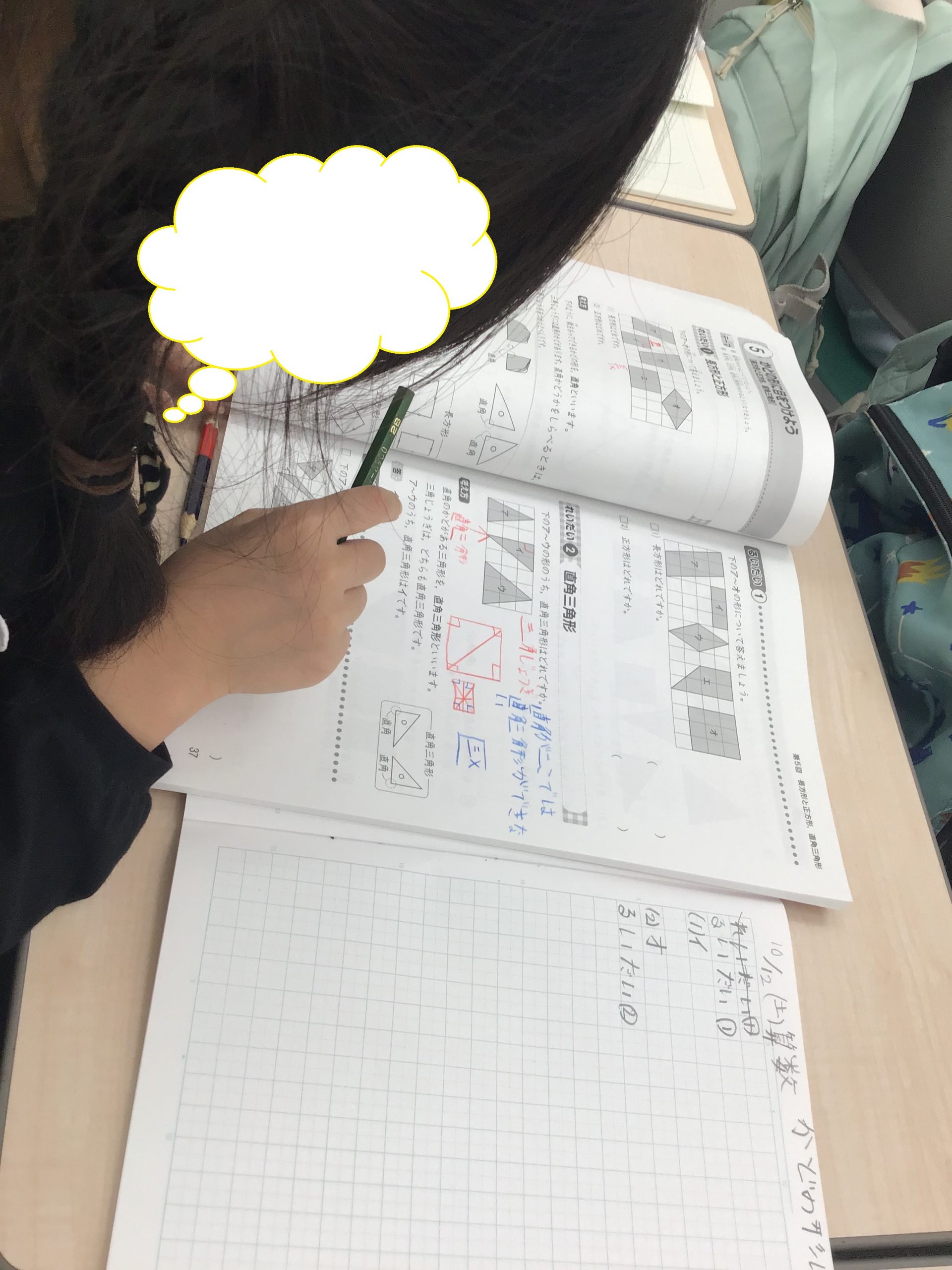土曜日は小2算数、かどの形に目をつけよう、でした。直角がわかったら、三角形の中に直角が2つある形ってある?といった問いかけをして考えてもらいました。「三角形の中に直角が2つ作ろうとすると辺が交わらなくなってしまうね。」すべては小6中3の過去問から逆算で指導です。