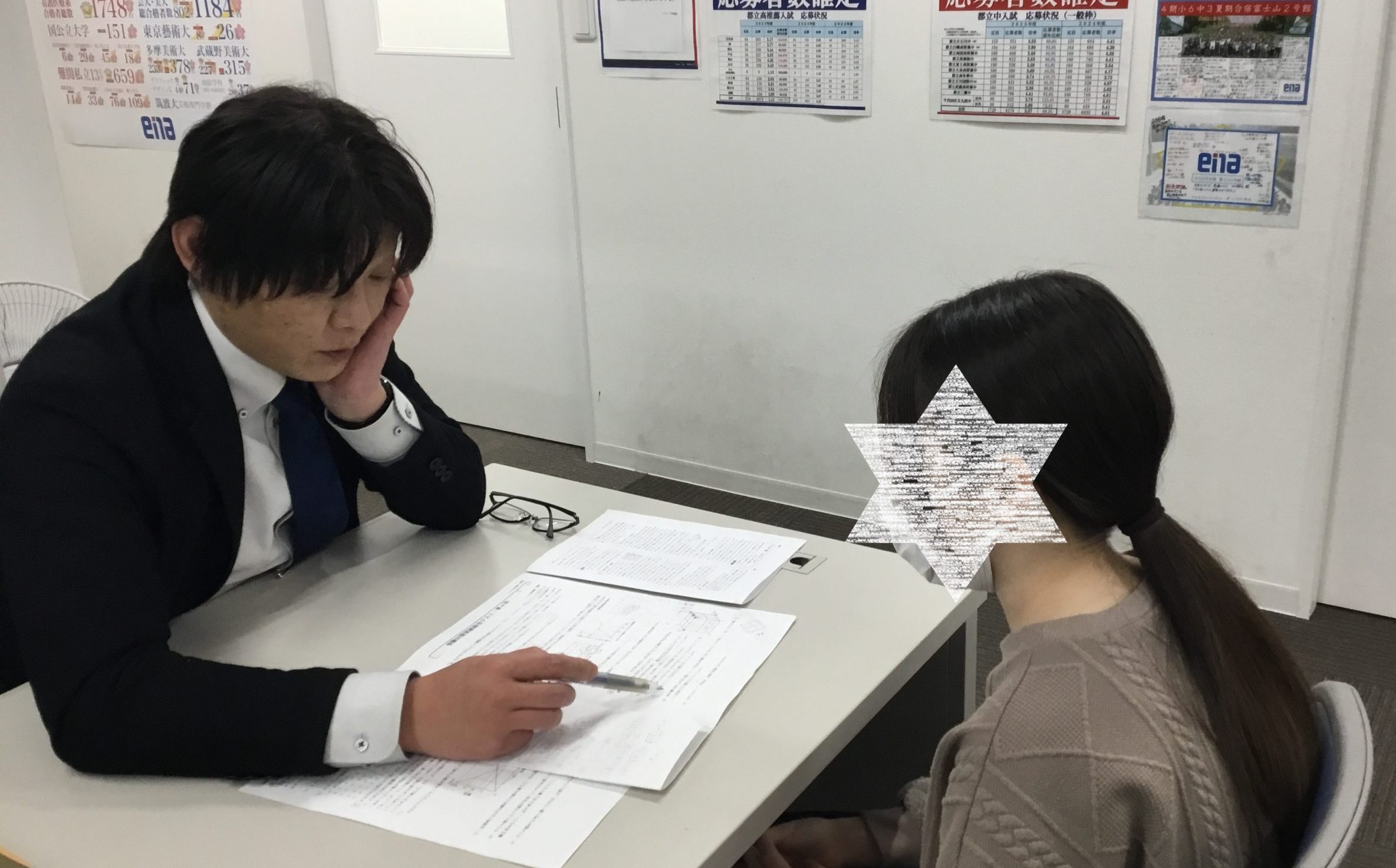 ▼森本先生に質問をする受検生。問題に取り組むときに大事なポイントを一緒に確認しています。