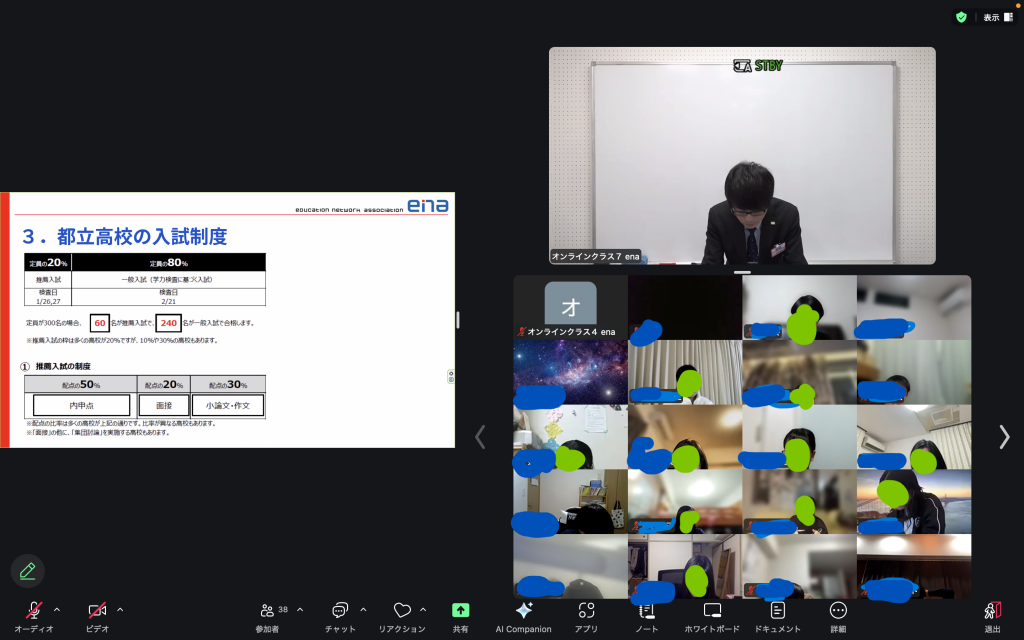 ガイダンスでは、内申点の仕組み、難関高校について、提出物の取り組み方、今後のエナでの取り組みなど