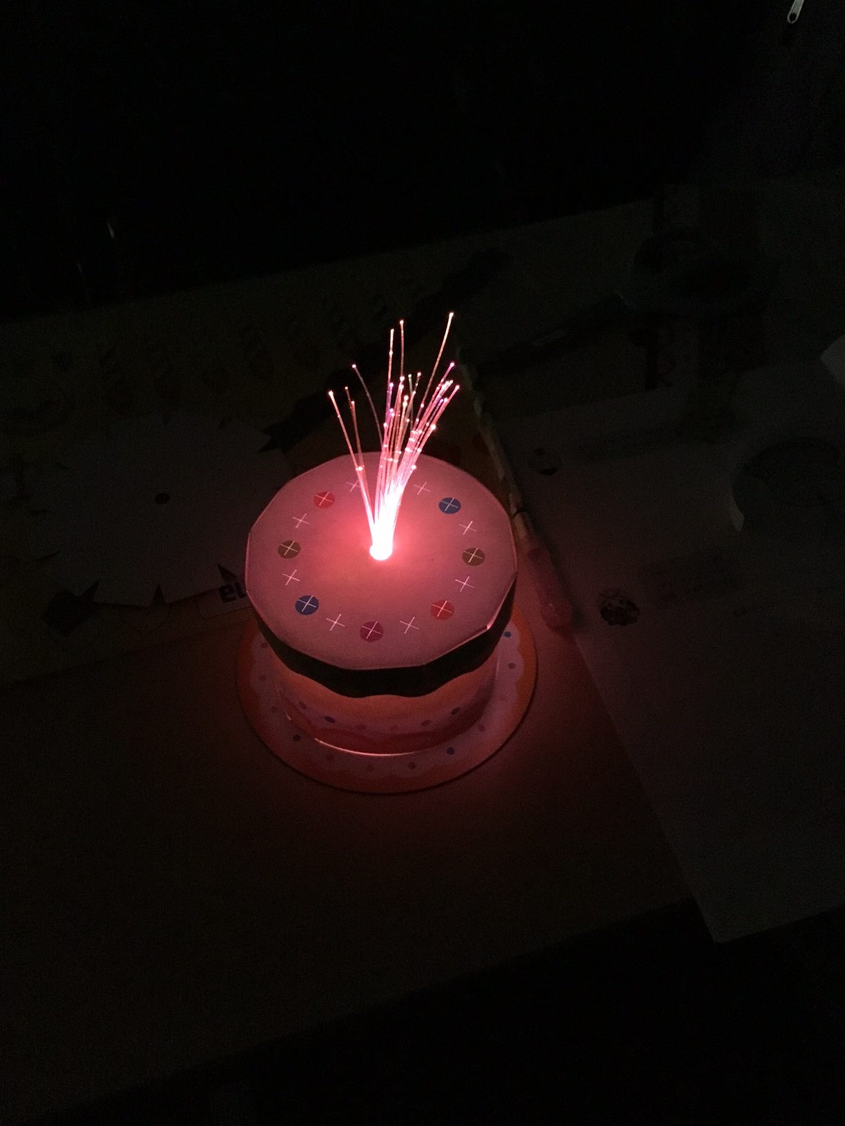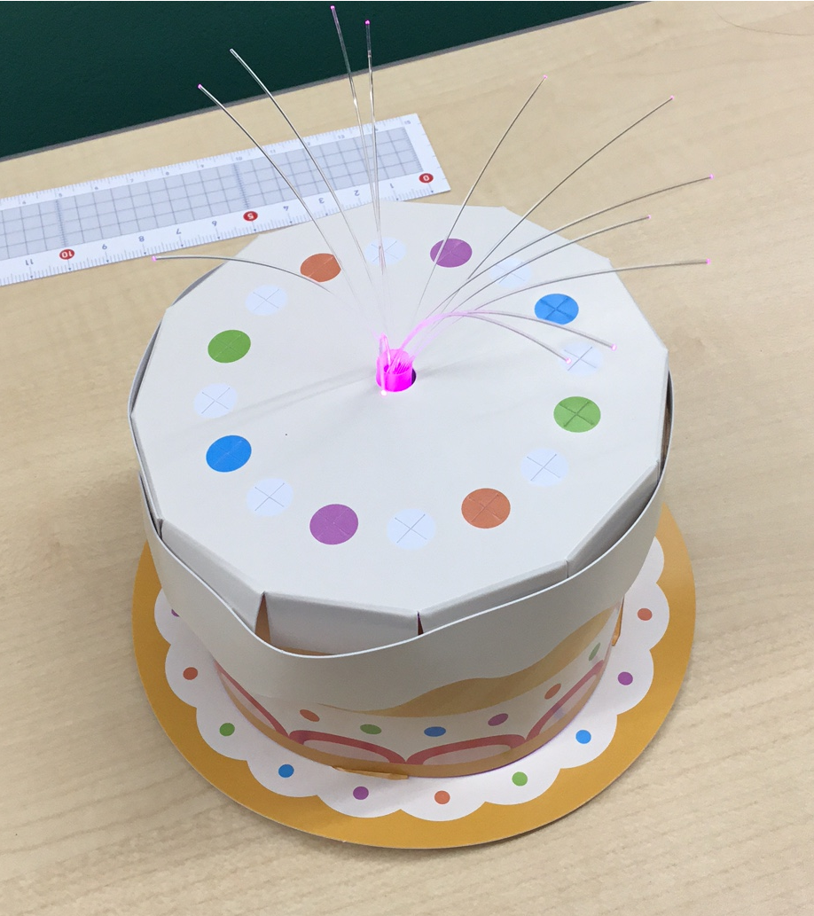 ▼最後は光ファイバーをケーキに見立てて完成です!教室を暗くしてみるとさらに綺麗に!