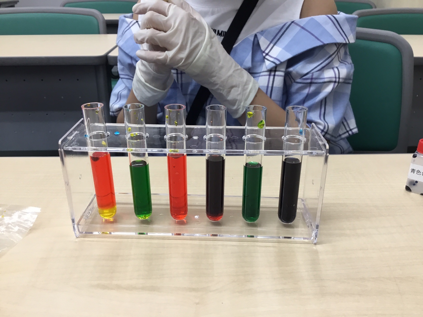 青・赤・黄の色を付けた水・砂糖水を用意し、試験管に少しずつ入れていきます。