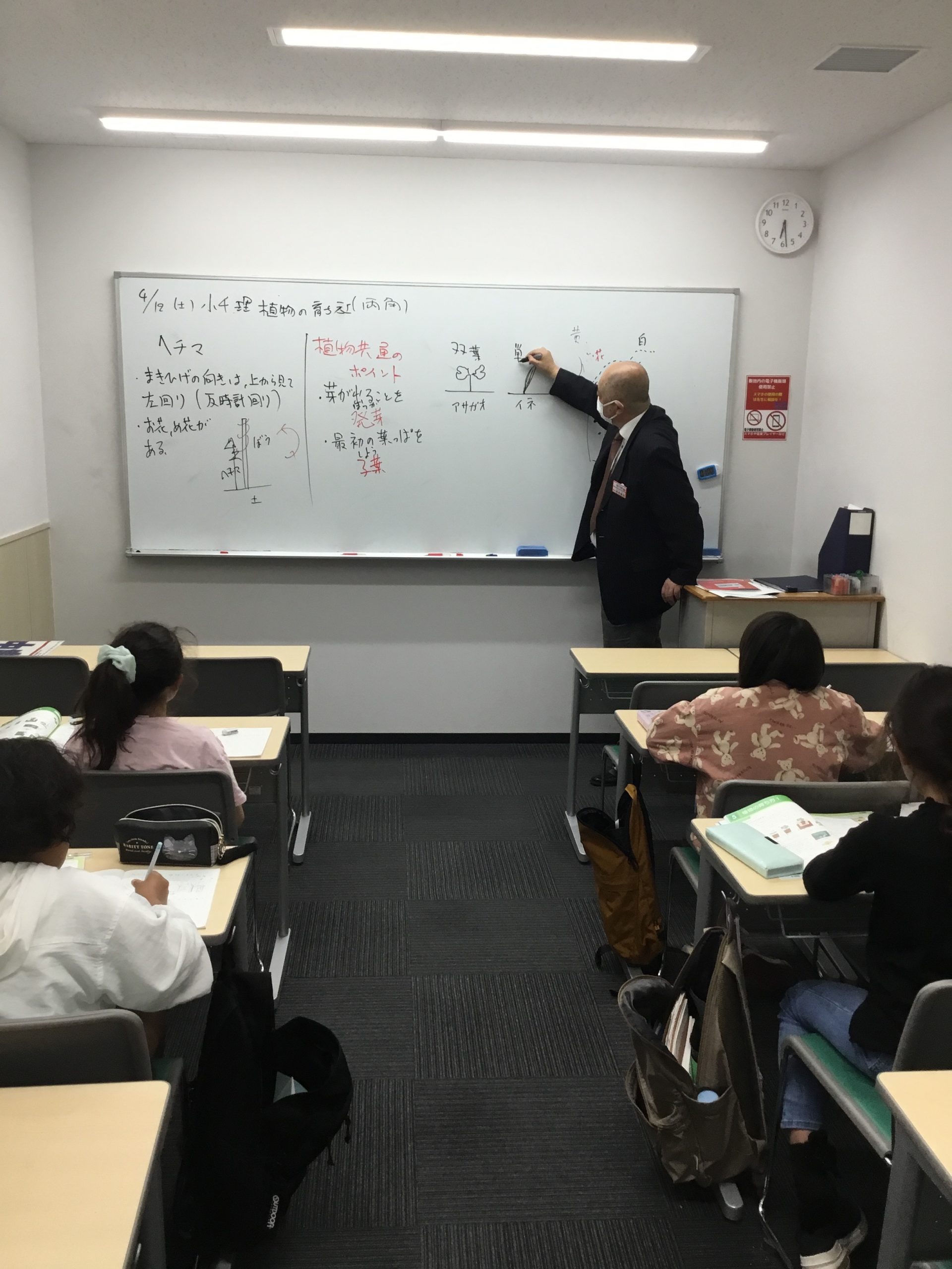 4年生、理科担当両角のイラストつきの説明をよく聞き、