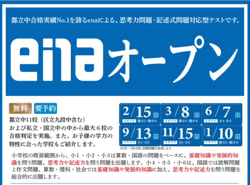 新小1~新小6のenaにお通いで無い方も受検できる無料模試です。