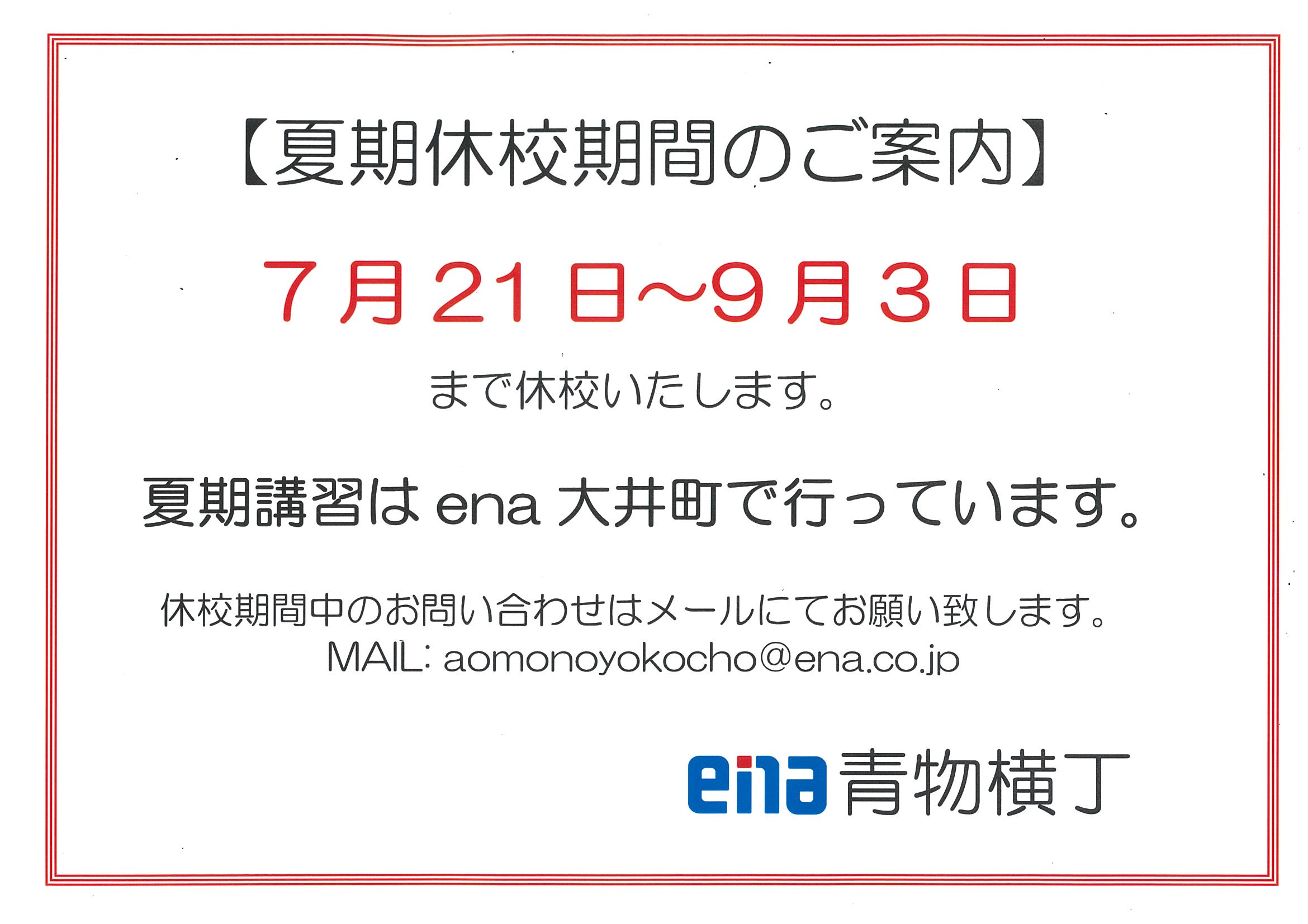 夏期講習期間中、青物横丁の校舎は休校となります。