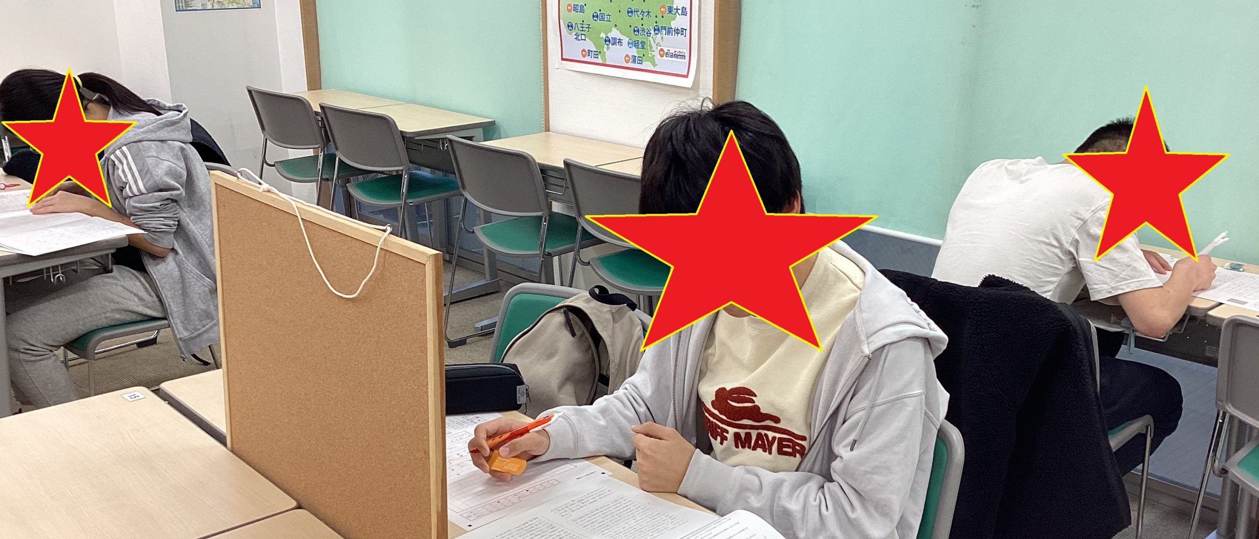 今回は、普段の教室ではなく、緊張感を持たせるため、場を変えて自習室にて、指定席で受けてもらいました。