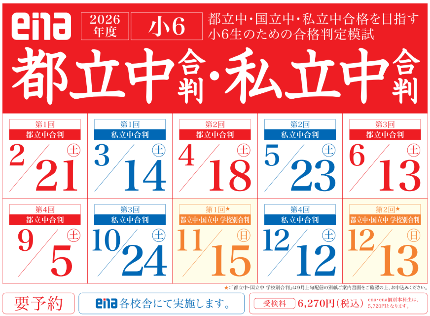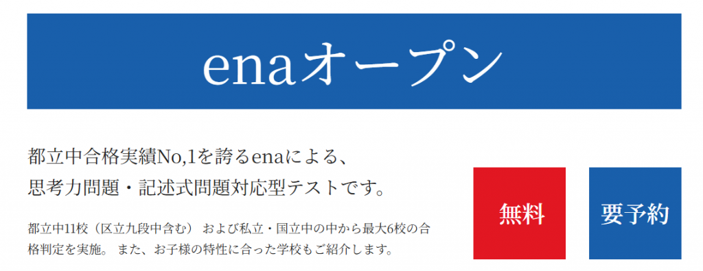 都立中で圧倒的な実績を誇るenaが実施する都立中、私立中合判のご案内です。本番同様の問題で自分の実力を確認しよう!