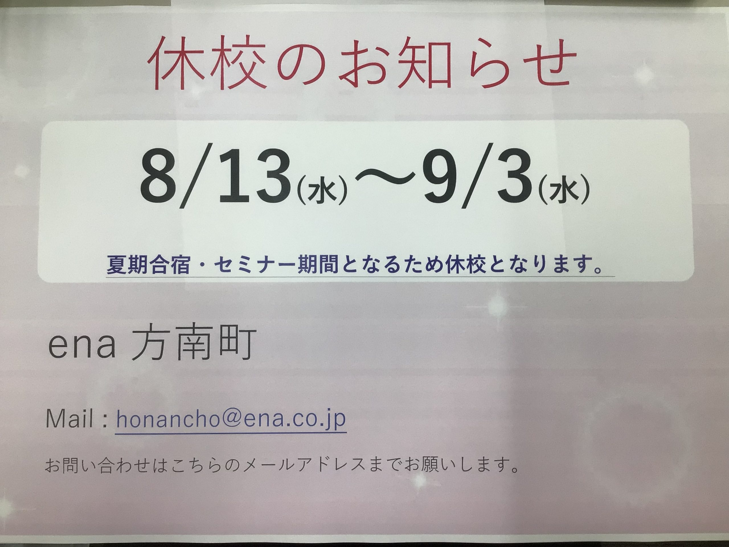 上記の通り、8/13~9/3までセミナー・夏期合宿のため、