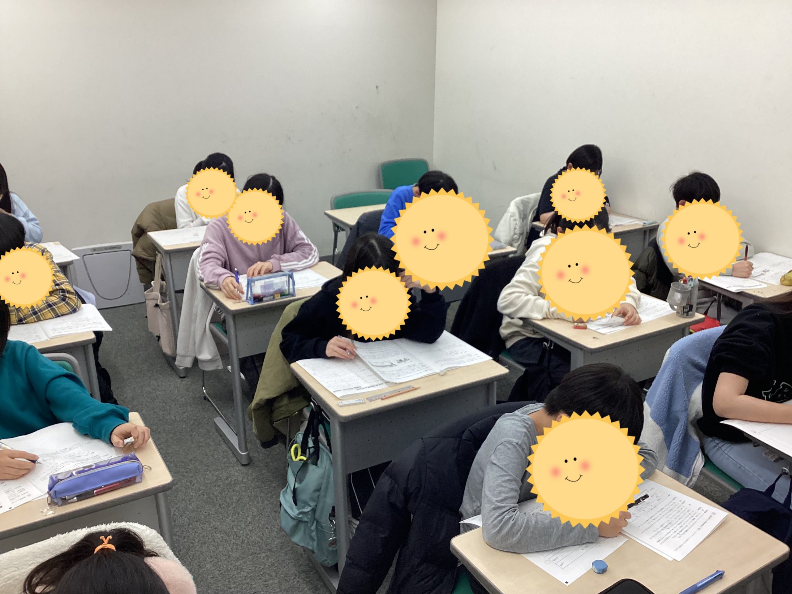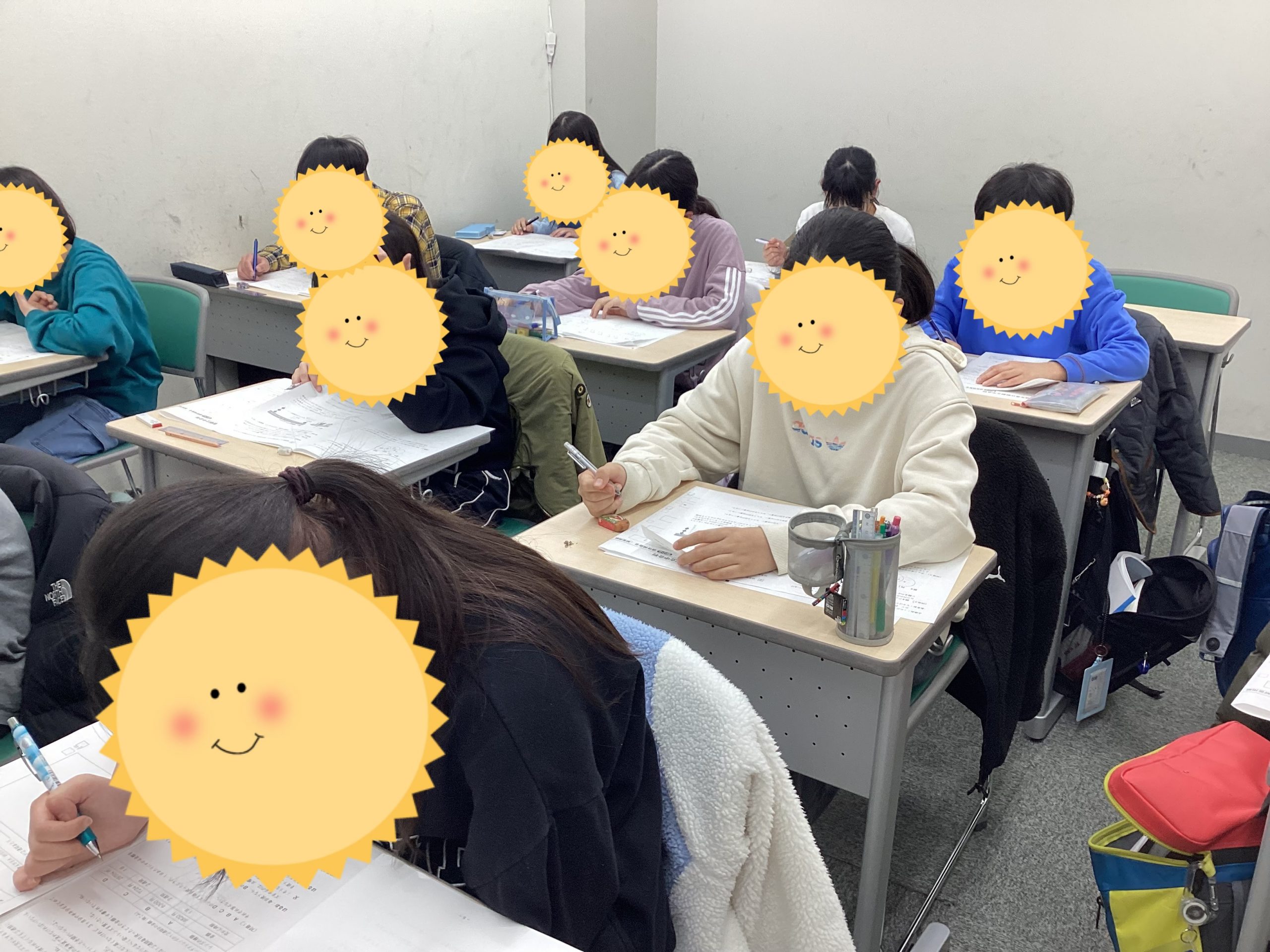 前のホワイトボードに過去問演習とありますが、これは私立中の過去問を演習している場面です。