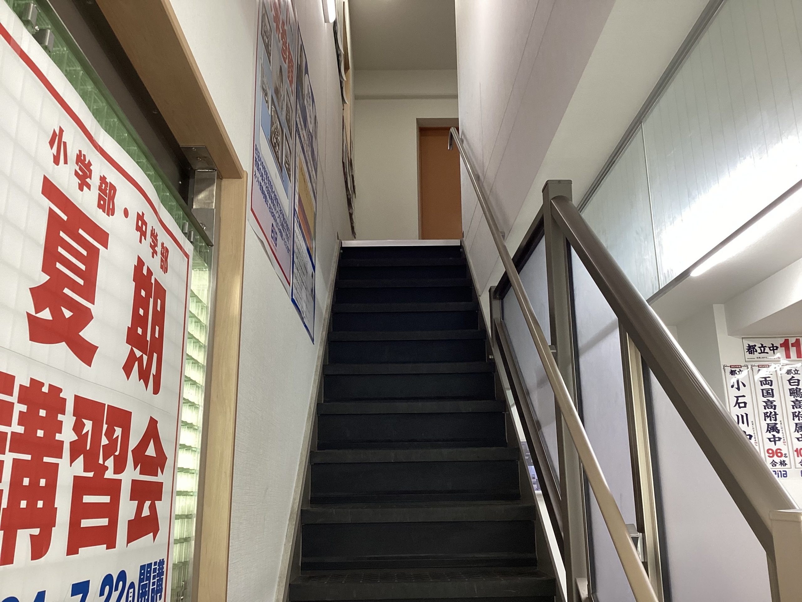 様々な掲示物や学力判定テストの結果も貼られている階段をのぼりきると、、、