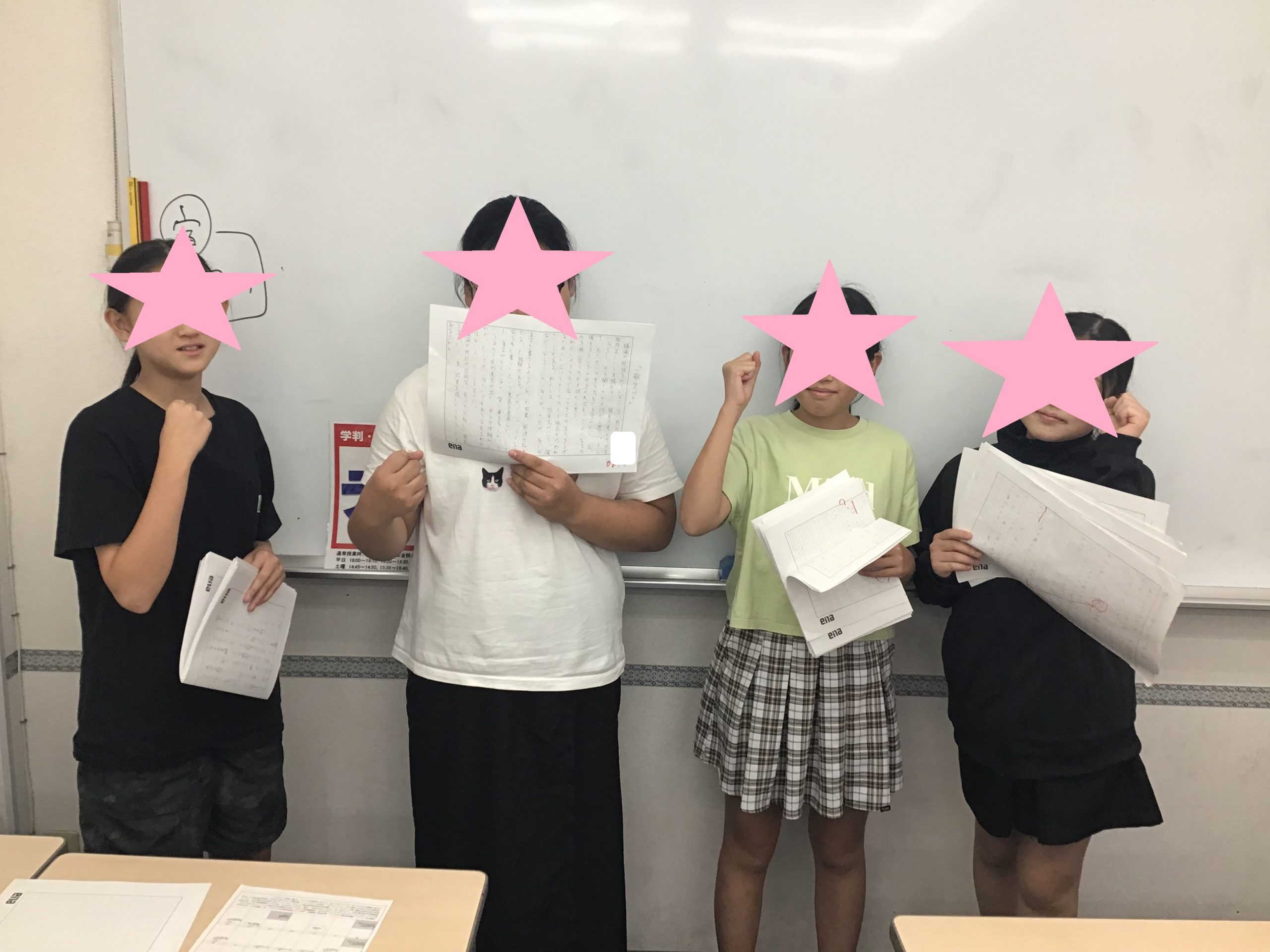 左の2名がずっと、1位と2位を争っている二人、右の2名夏から入学したばかりの二人で、現在同数になっています。 上の写真の4人を含めて、みんな一枚でも多く提出しようと頑張っています。