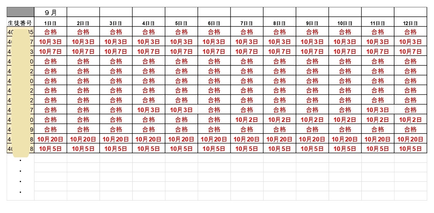 非受験学年(当然受験学年も)は、下のように日々学の点検を、ページごとに毎週点検し、遅れたところは、生徒と決めた締め切り日を入力して完遂の徹底をしていきます。(下記は毎回授業報告とともに送っている『日々学提出状況』のシート)